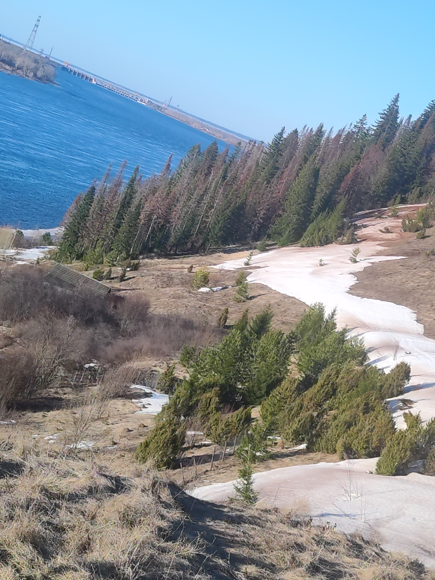 The image shows a landscape in Noviy, Russia, with a large body of water, possibly the Volga River, visible in the background, reflecting a clear blue sky. A power line and a dam-like structure are se…read more