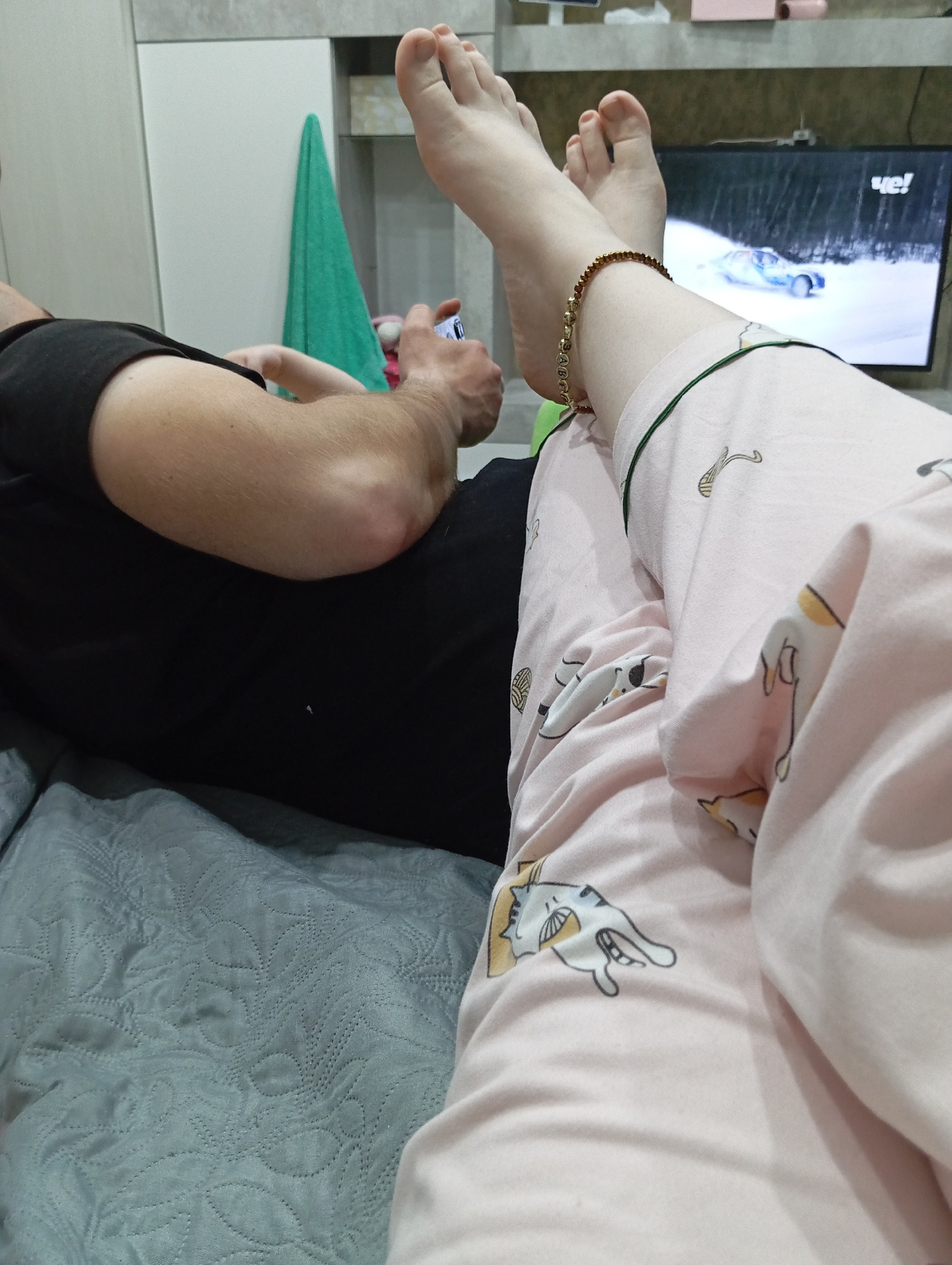 A person in pink patterned pajamas is seated on a light blue patterned cushion. The person's bare feet are raised, with a gold ankle bracelet visible on one ankle. Another person is seen in a black sh…read more