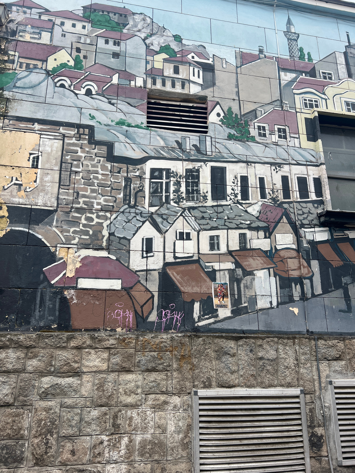 The image shows a wall mural in the city of Plovdiv, Bulgaria. The mural is painted on ceramic tiles and depicts a cityscape. The style of the mural is somewhat abstract, with simplified shapes and a…read more