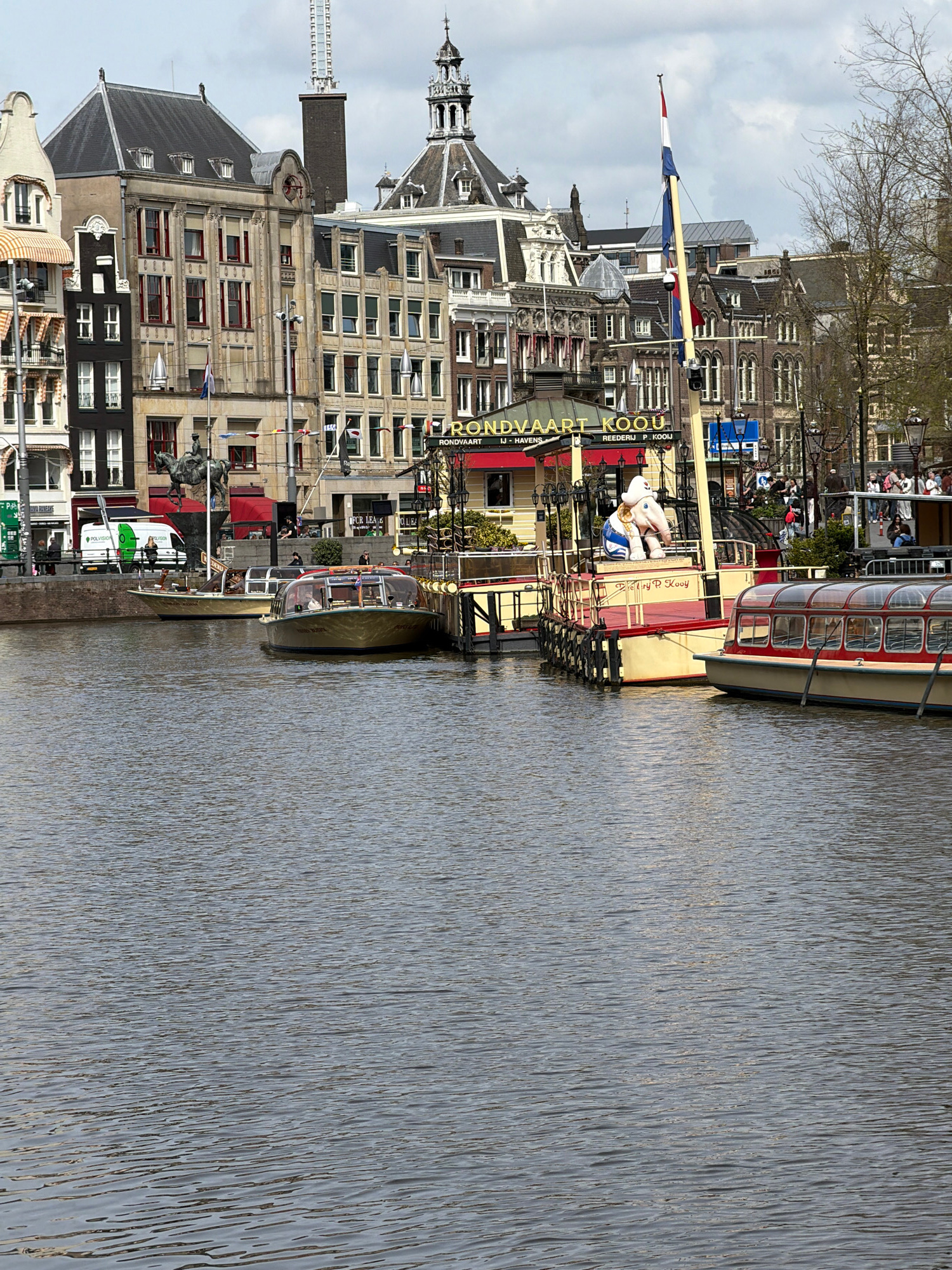 This image captures a daytime scene along a canal in Amsterdam, Netherlands, featuring historical architecture, canal boats, and subtle signs of urban life. The perspective is from the canal, looking…read more