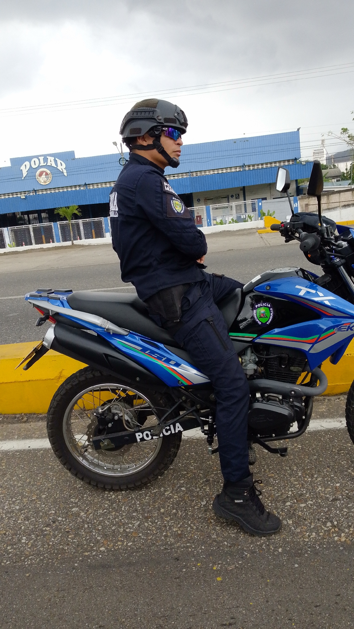 A uniformed police officer is seated on a blue and black motorcycle along a road. The motorcycle is labeled "Policia" on the rear. The officer wears a dark blue uniform, black boots, a tactical helmet…read more