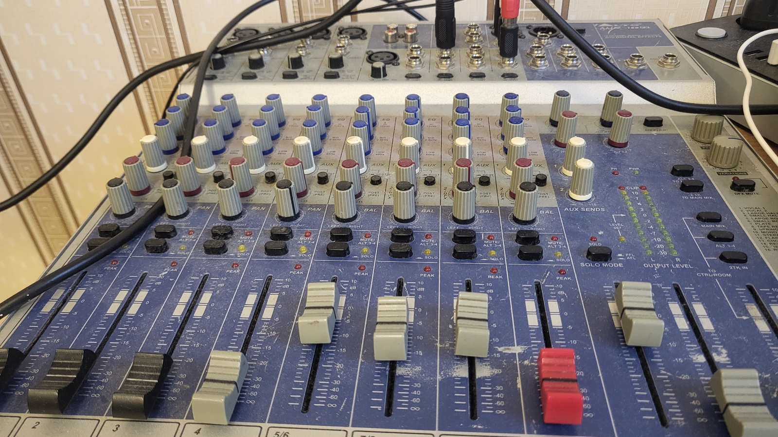 The image captures a detailed, eye-level view of an audio mixing console, likely in an indoor setting such as a studio or control room in Марковский, Russia. The main subject is a blue and gray multi-…read more