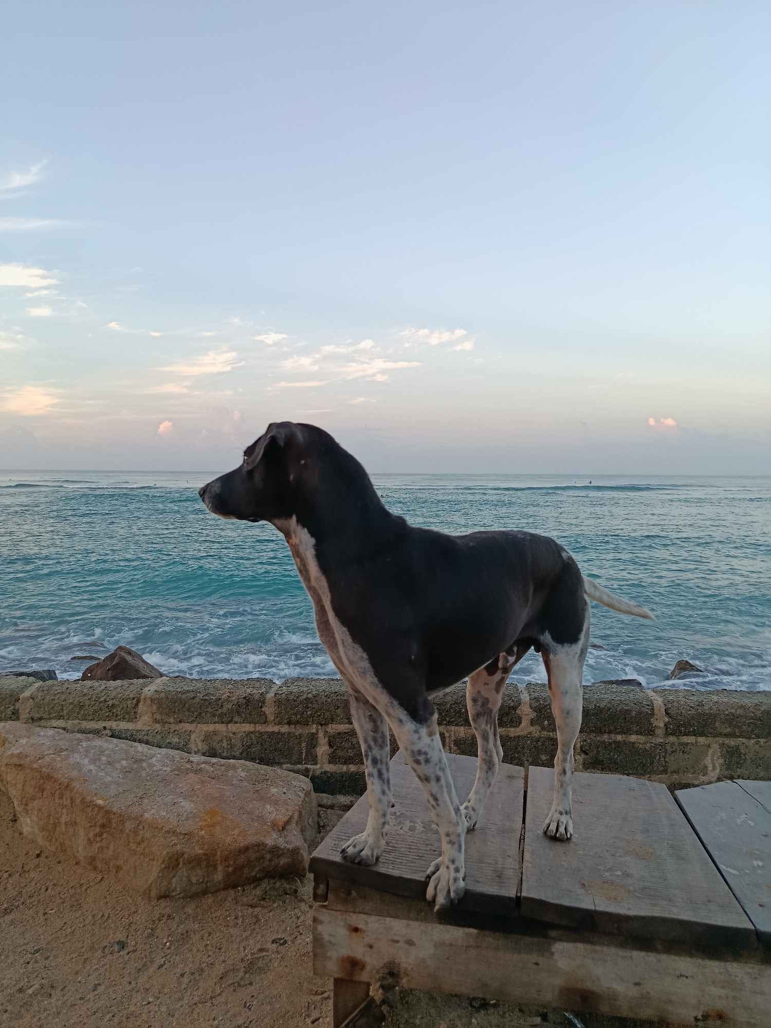 A medium shot captures a black and white dog standing on a weathered wooden platform, likely part of a pier or coastal structure. The dog is positioned against a backdrop of the ocean, with a low wall…read more