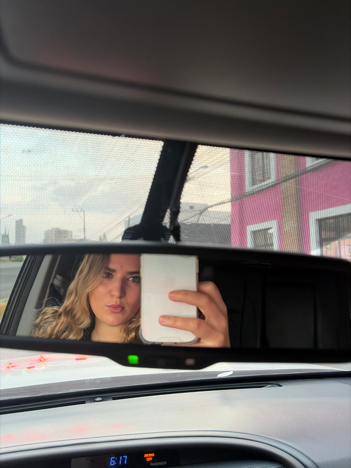 The image depicts a first-person view from inside a stationary vehicle, looking through the windshield and into the rearview mirror, which serves as the primary subject. The time displayed on the vehi…read more