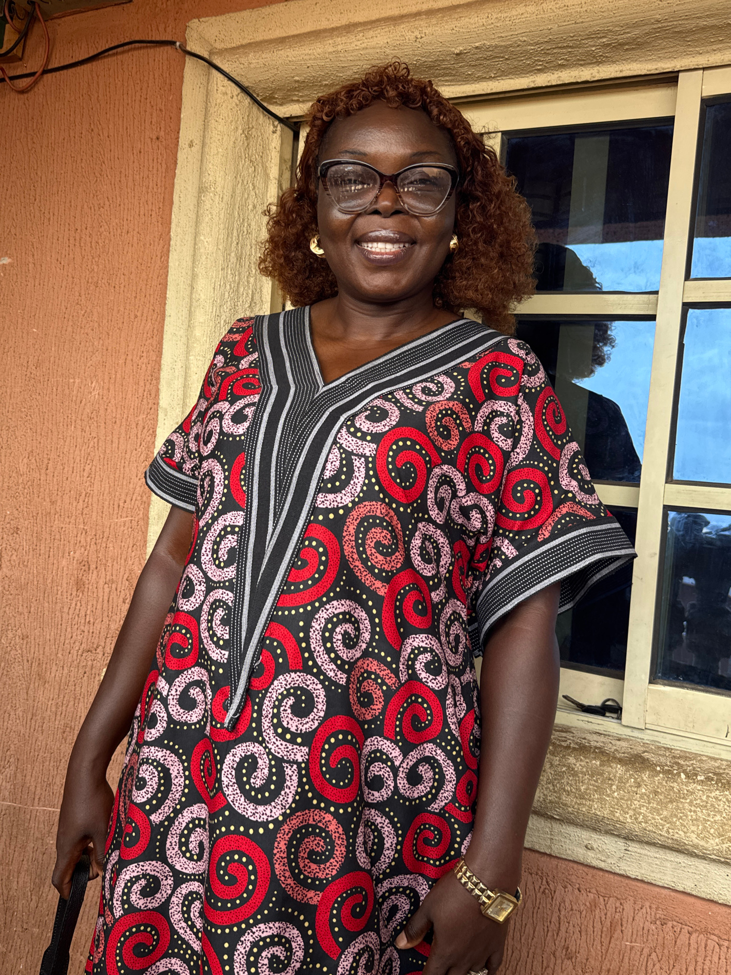 A woman stands in front of a window. She is smiling and wearing glasses. The woman is wearing a dress with red, pink, and yellow patterns, with black and white striped trim. She is also wearing a gold…read more