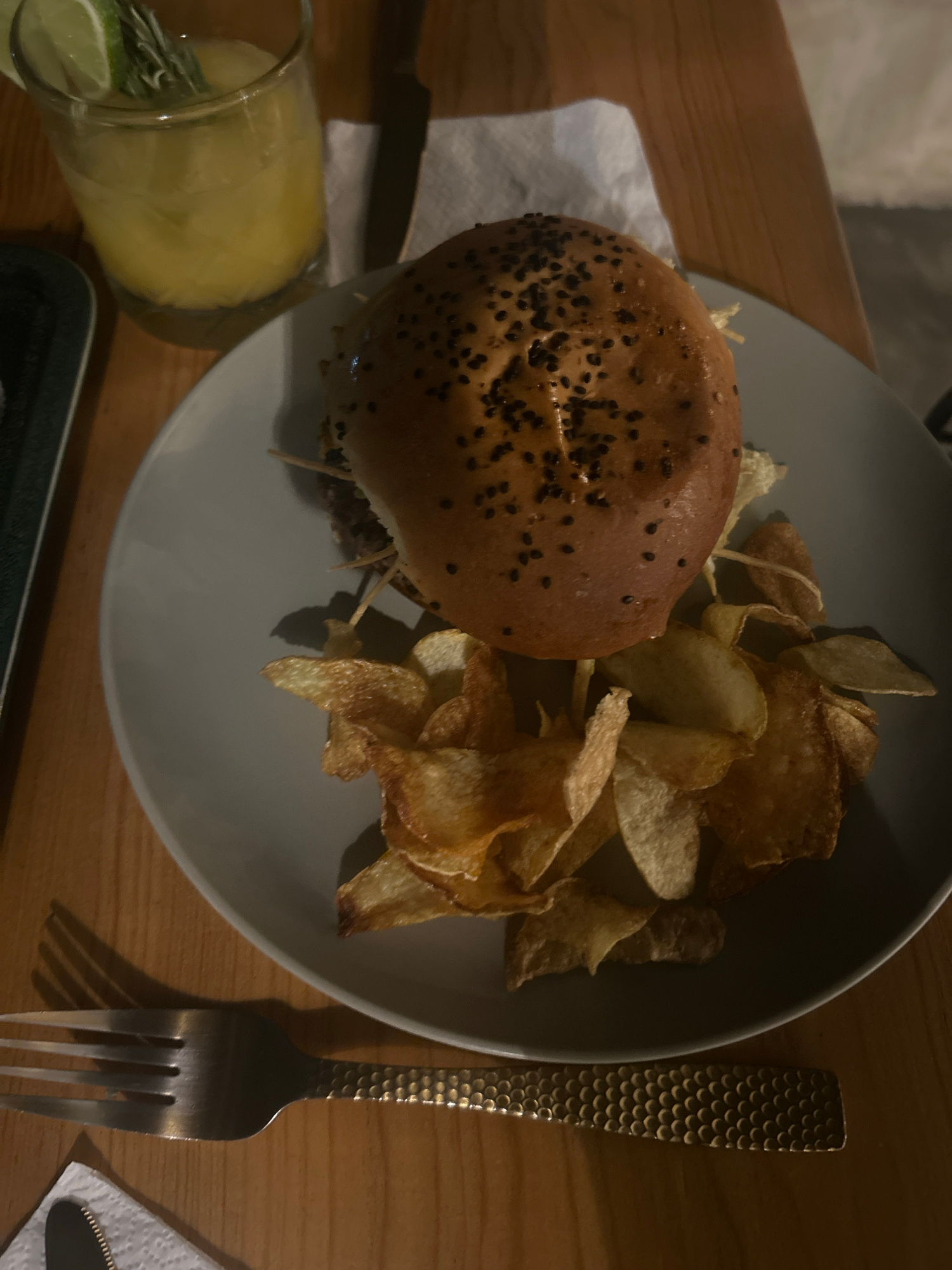 A close-up, high-angle shot captures a plate with a hamburger and potato chips. The hamburger, topped with sesame seeds, occupies the left side of the plate, while a pile of chips fills the right. A f…read more