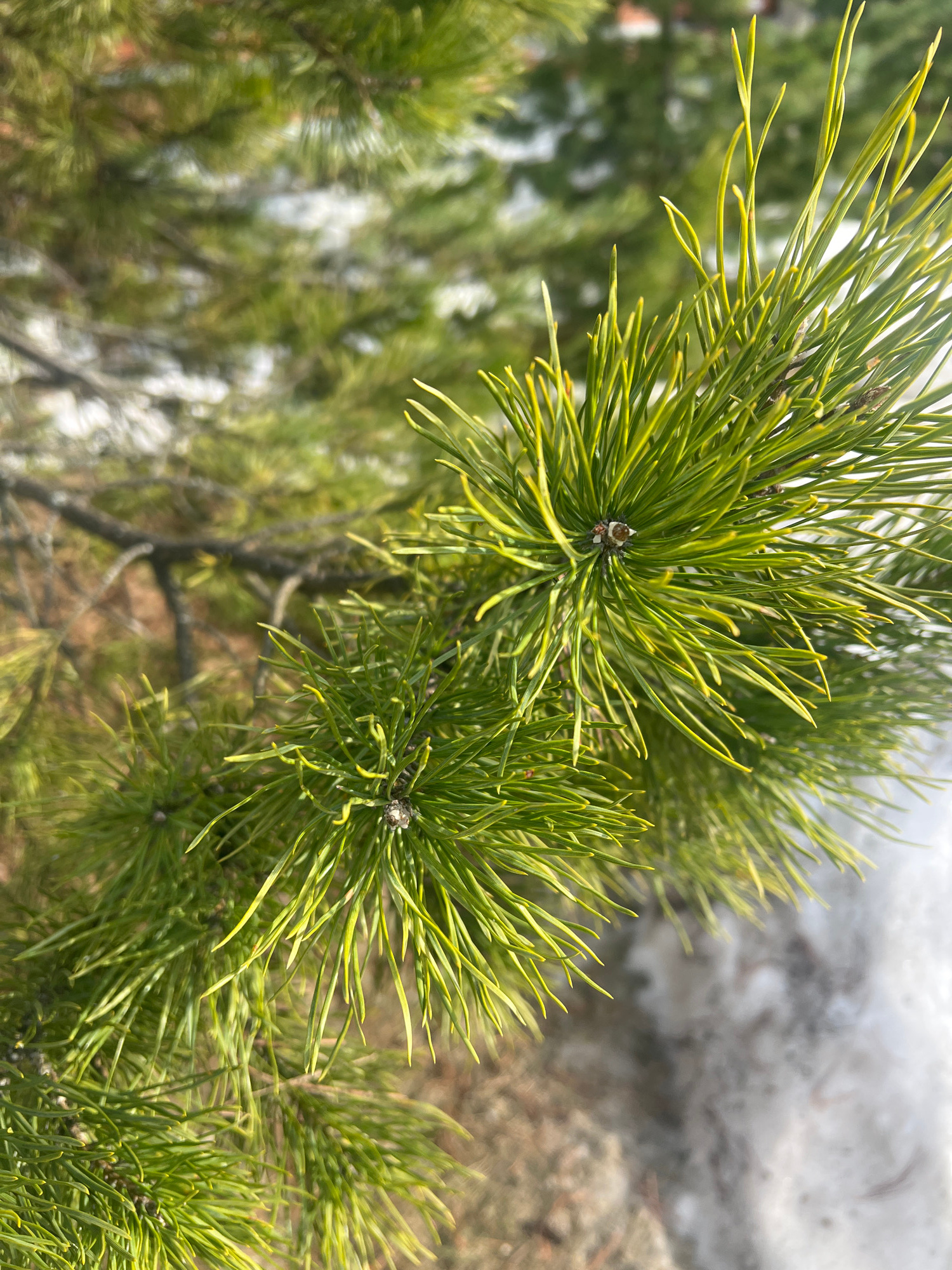 A close-up shot taken in Noviy, Russia, focusing on a branch of what appears to be a pine tree. The needles are green with a yellowish tint. The background consists of out-of-focus greenery, possibly…read more