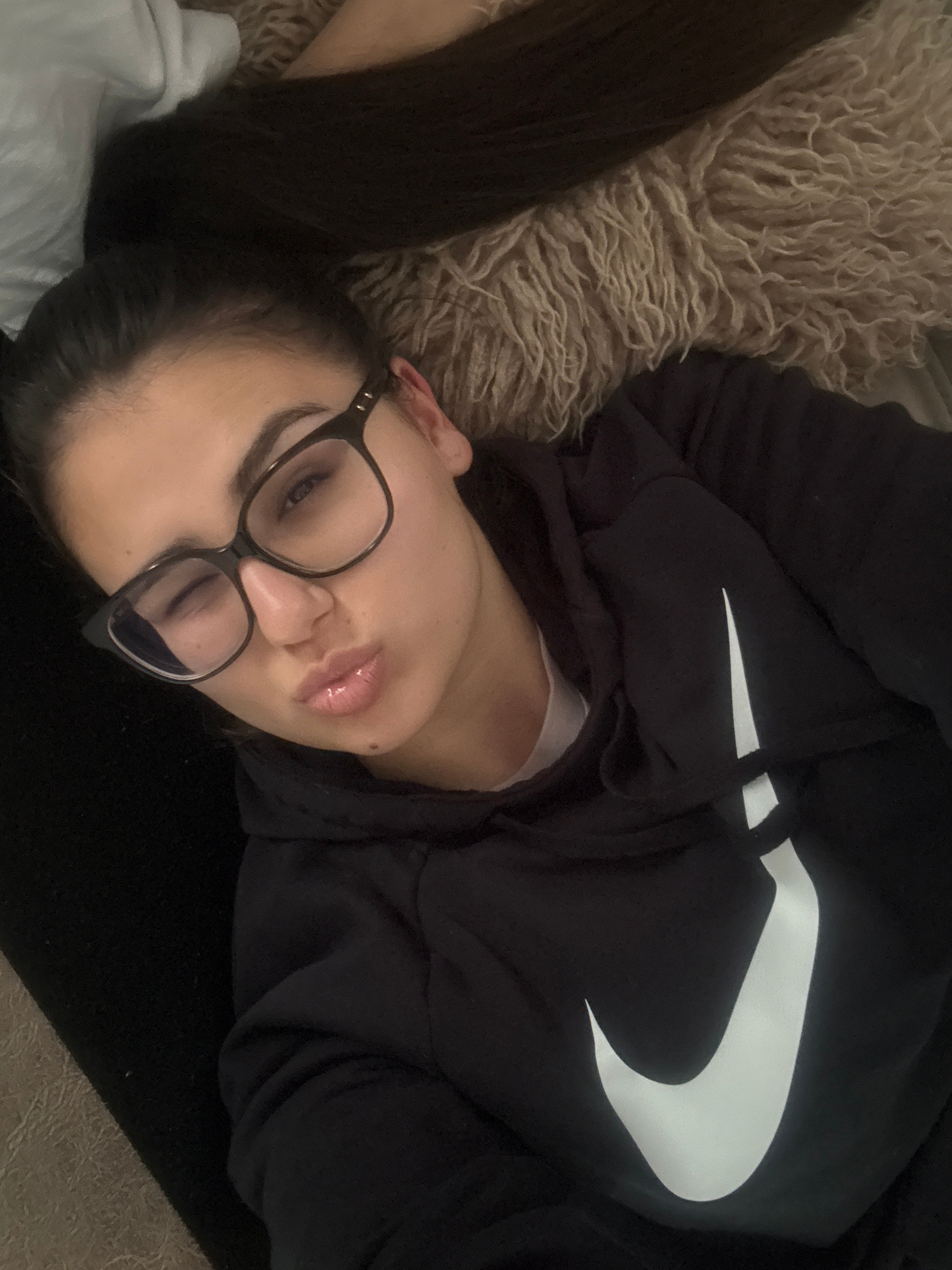 An overhead, close-up shot depicts a person, likely a young female, lying down indoors. She has dark hair and is wearing black-framed glasses. Her head rests on a fluffy, light beige or off-white text…read more