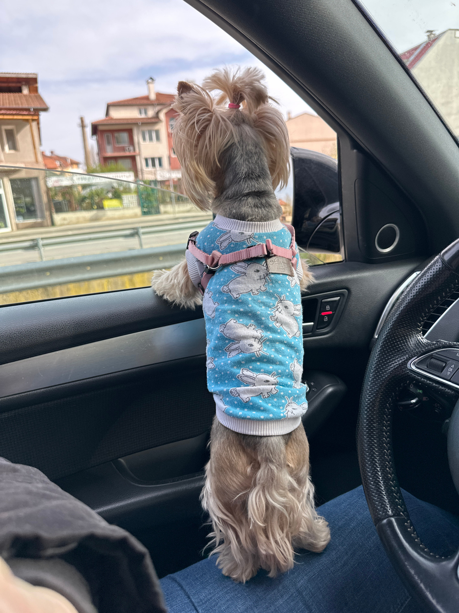 A small, light-brown dog wearing a blue sweater with white rabbit designs and a pink harness is sitting inside a car. The dog is positioned near the open window on the passenger side, looking out at t…read more