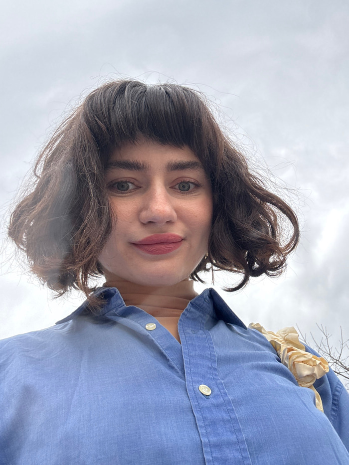 A woman with short, dark, curly hair and light eyes looks directly at the camera from a low angle. She is wearing a button-down light blue shirt with a ruffled flower detail on the shoulder. Her lips…read more
