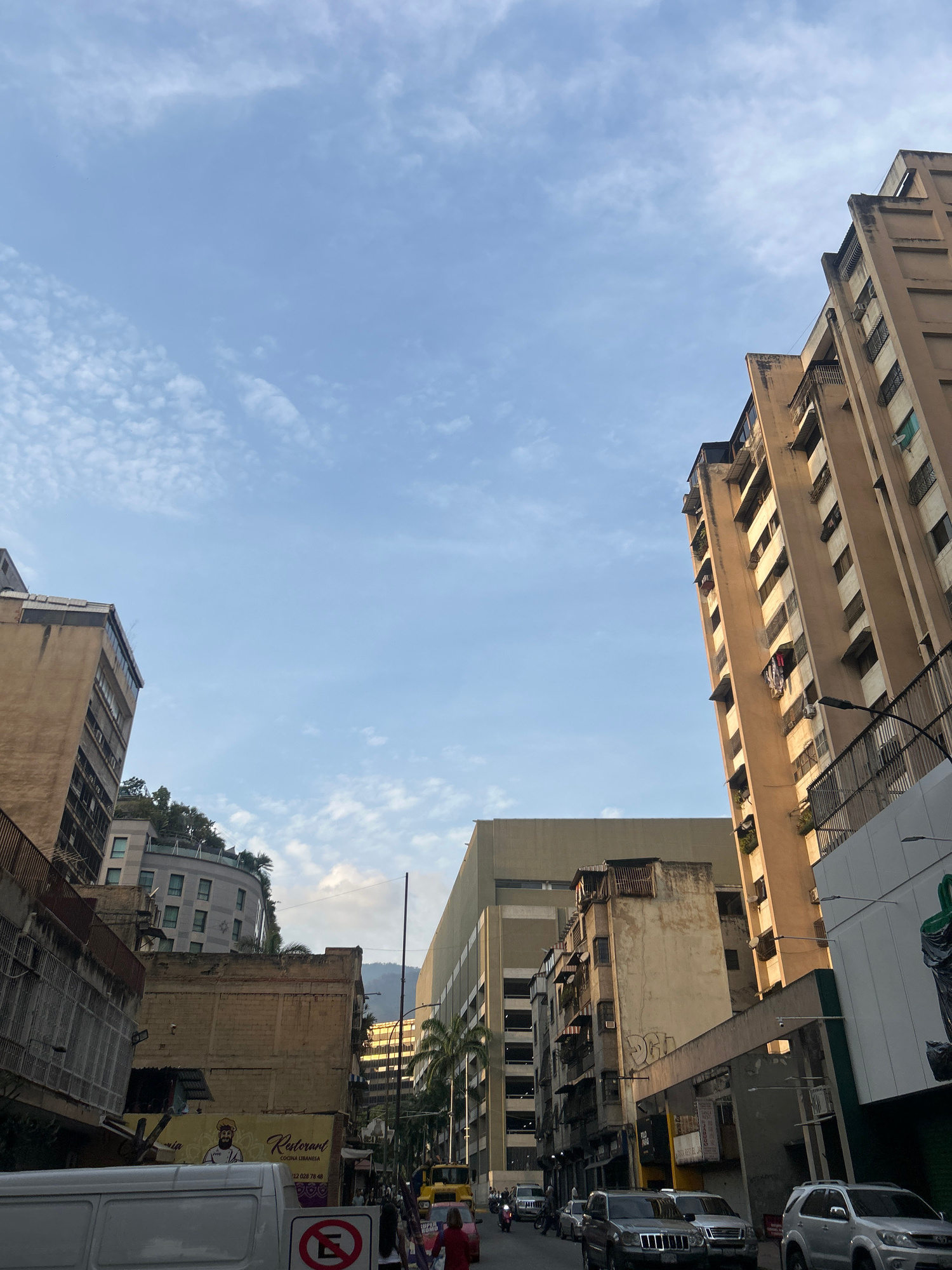 Looking up at the sky from a street in Caracas, Venezuela, tall buildings line the narrow space, their aging facades showing signs of wear. Light-colored structures dominate the upper part of the fram…read more