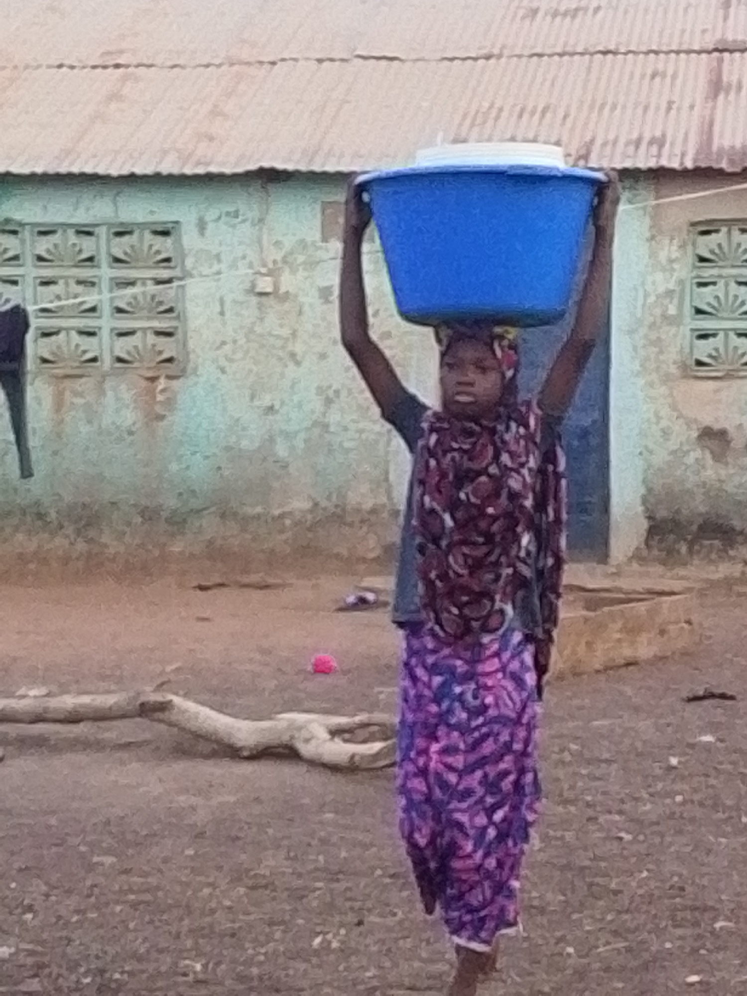 A young woman stands in a dirt-covered yard, carrying a large blue basin on her head. She is wearing a patterned headscarf, a dark top, and a long, purple and pink patterned skirt. The yard has scatte…read more