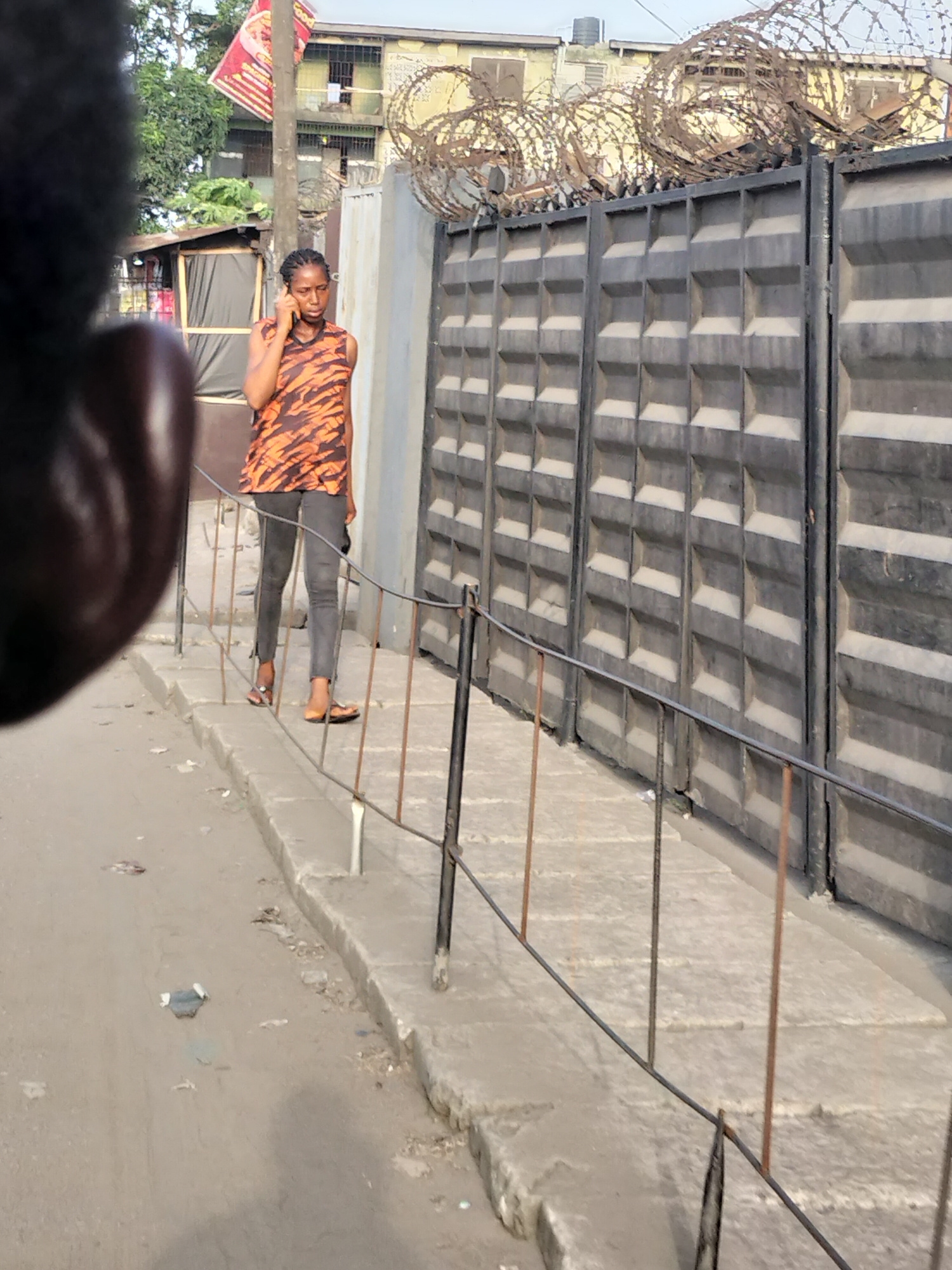 The image shows a street scene in Alaiyabiagba, Nigeria. A woman is walking along a concrete sidewalk while talking on a cell phone. She is wearing a brown and orange animal print sleeveless top, gray…read more