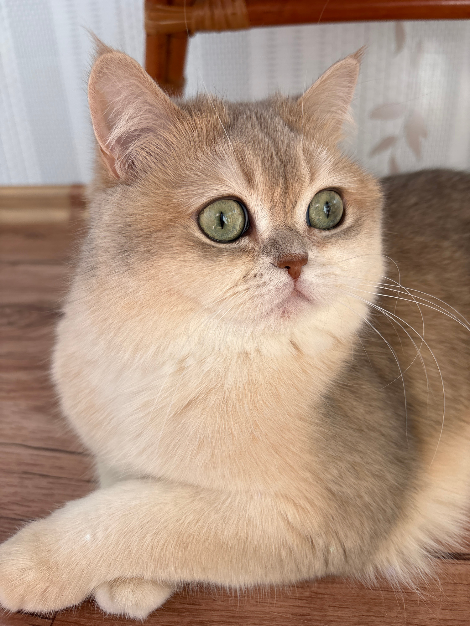 A close-up, slightly canted, high-angle shot shows a light-colored cat with striking green eyes. The cat is looking directly at the camera. The background appears to be part of a wooden surface or flo…read more