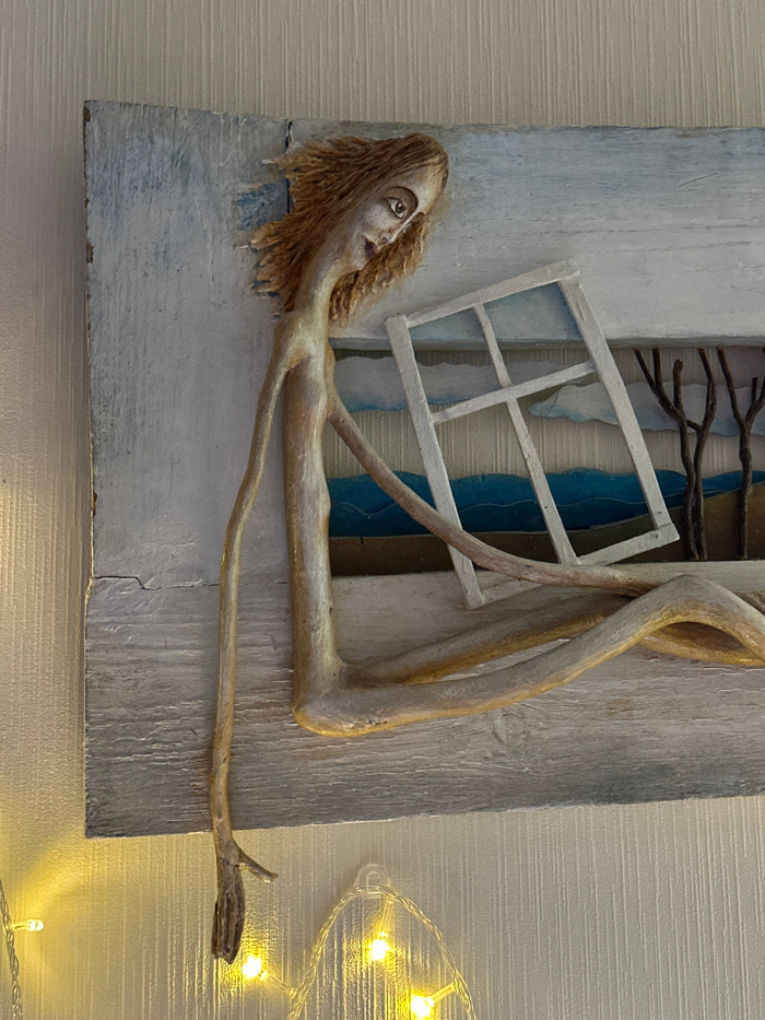 A mixed media artwork depicts a stylized human figure merged with tree-like elements. The figure, with light skin and straw-like hair, seems to emerge from a textured, white and gray painted surface r…read more