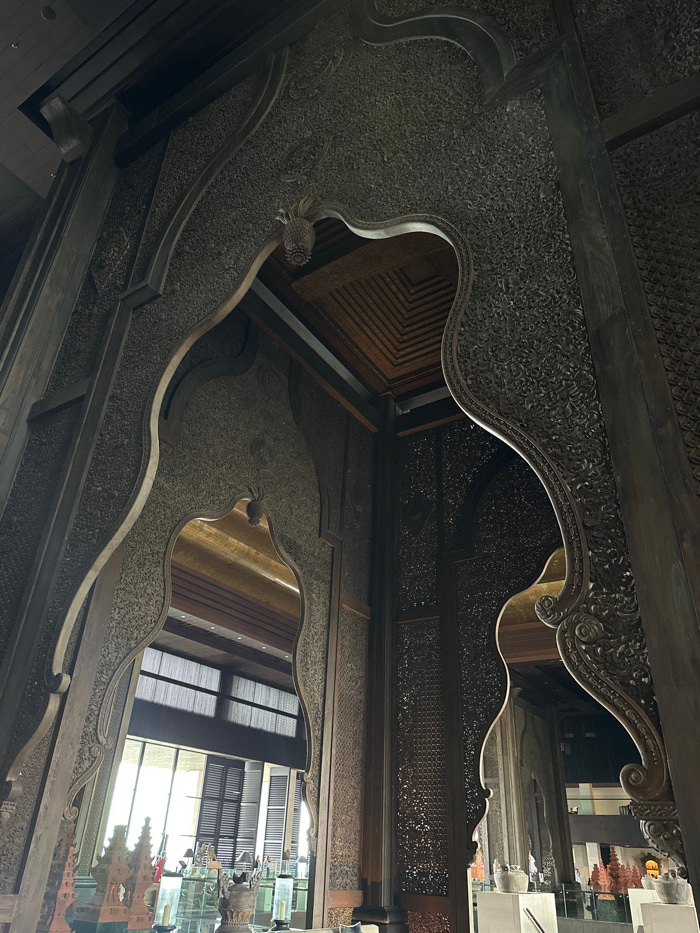 The image displays an interior architectural scene within a luxury resort in Nusa Dua, Indonesia. The foreground is dominated by two large, dark-stained wooden archways, intricately carved with tradit…read more