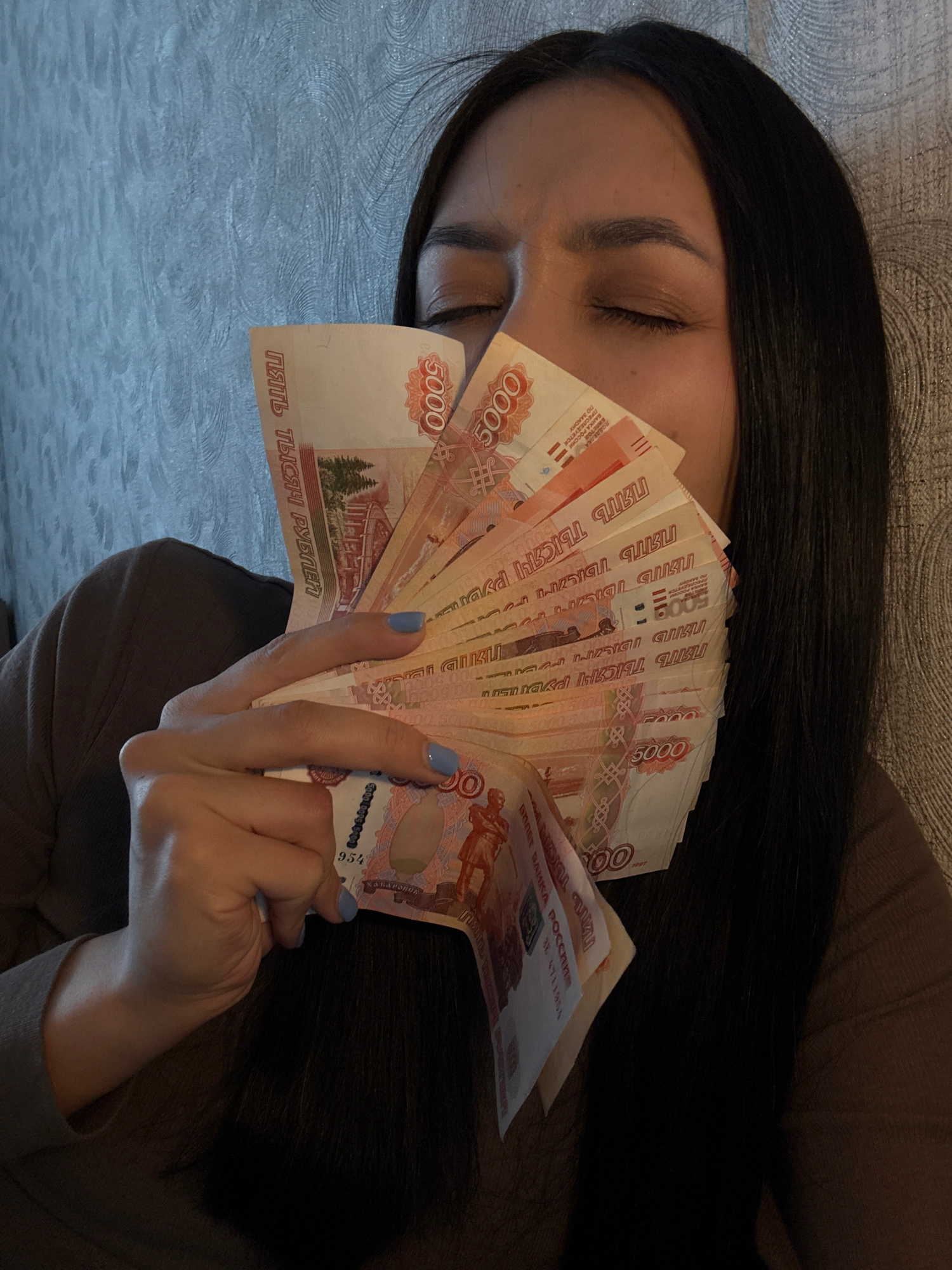 A woman with closed eyes is holding a fan of Russian 5000-ruble banknotes in front of her face. She has long, dark hair and her fingernails are painted light blue. Her top appears to be a brown or graβ¦read more