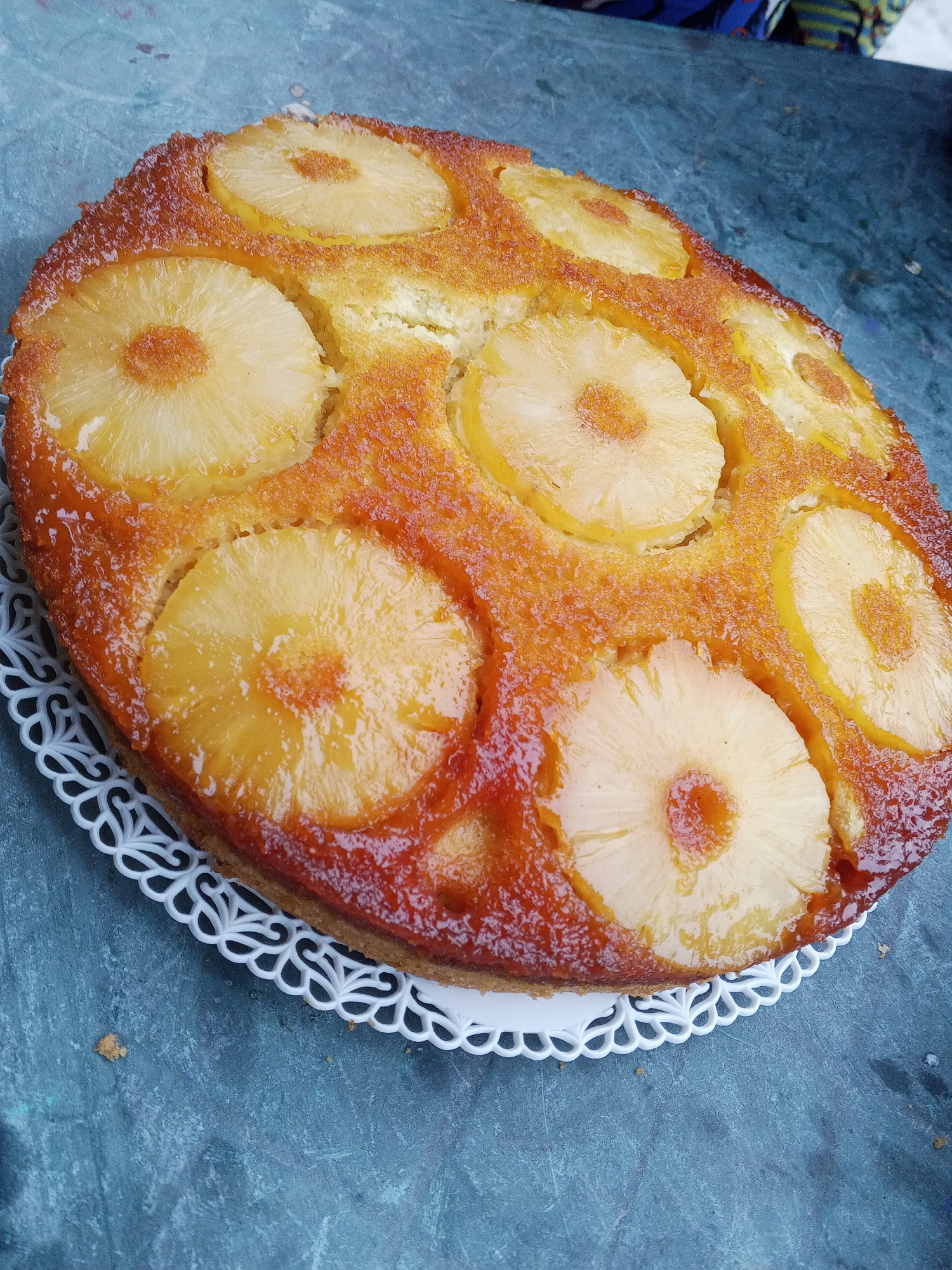 The image shows a pineapple upside-down cake on a white, decorative paper doily. The cake consists of a golden-brown sponge base with caramelized pineapple slices arranged in a circular pattern on top…read more