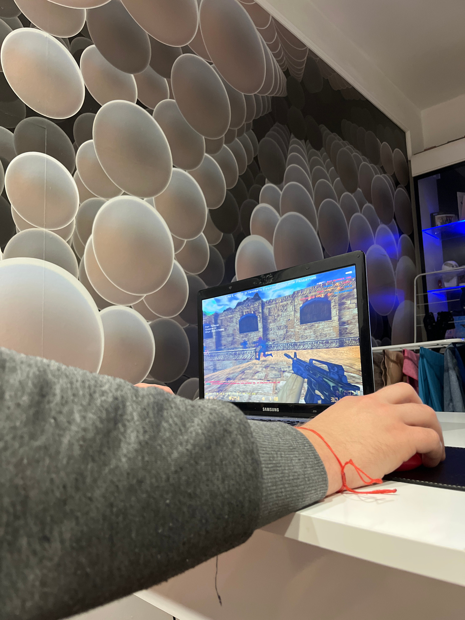 A person wearing a gray long-sleeved shirt and a red string bracelet on their left wrist is holding a Samsung tablet. The tablet displays a first-person shooter video game. The person is standing indo…read more