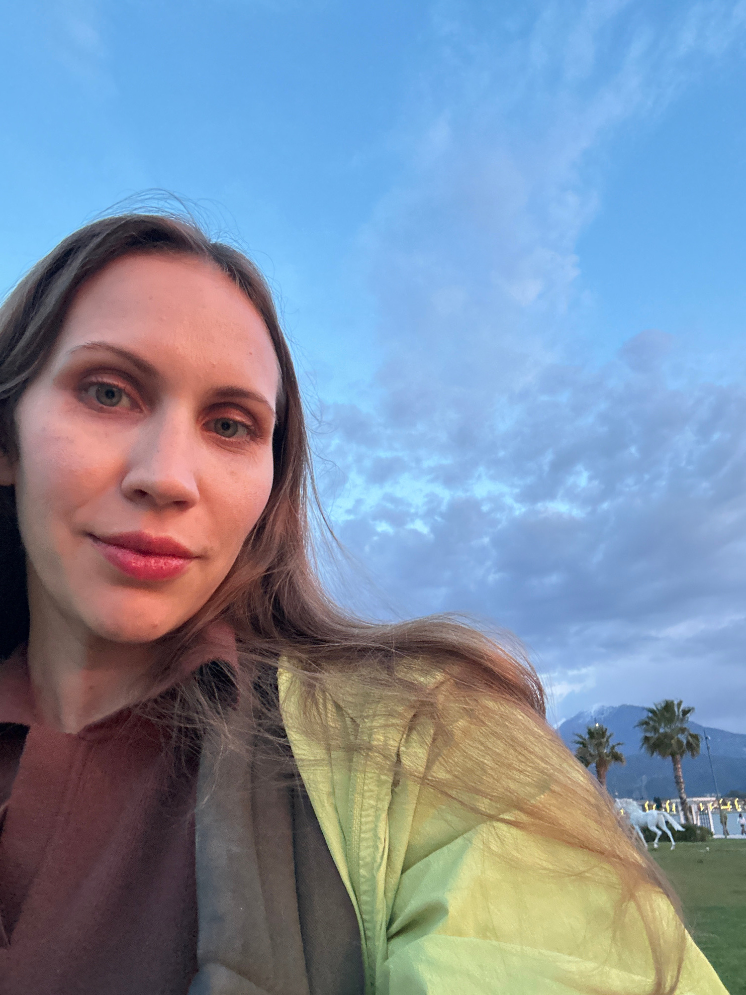 A low-angle selfie shot of a fair-skinned woman with light brown hair. She is wearing a yellow jacket over a dark brown shirt. The background shows a blue, cloud-filled sky. In the top right corner, t…read more