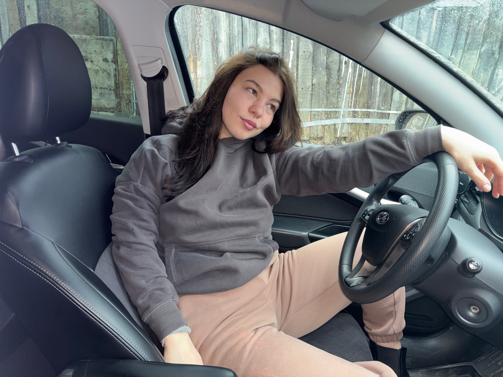 A woman is seated in the driver's seat of a car, facing the camera. She is wearing a grey long-sleeved hoodie and light brown sweatpants. The interior of the car is visible, including the steering whe…read more