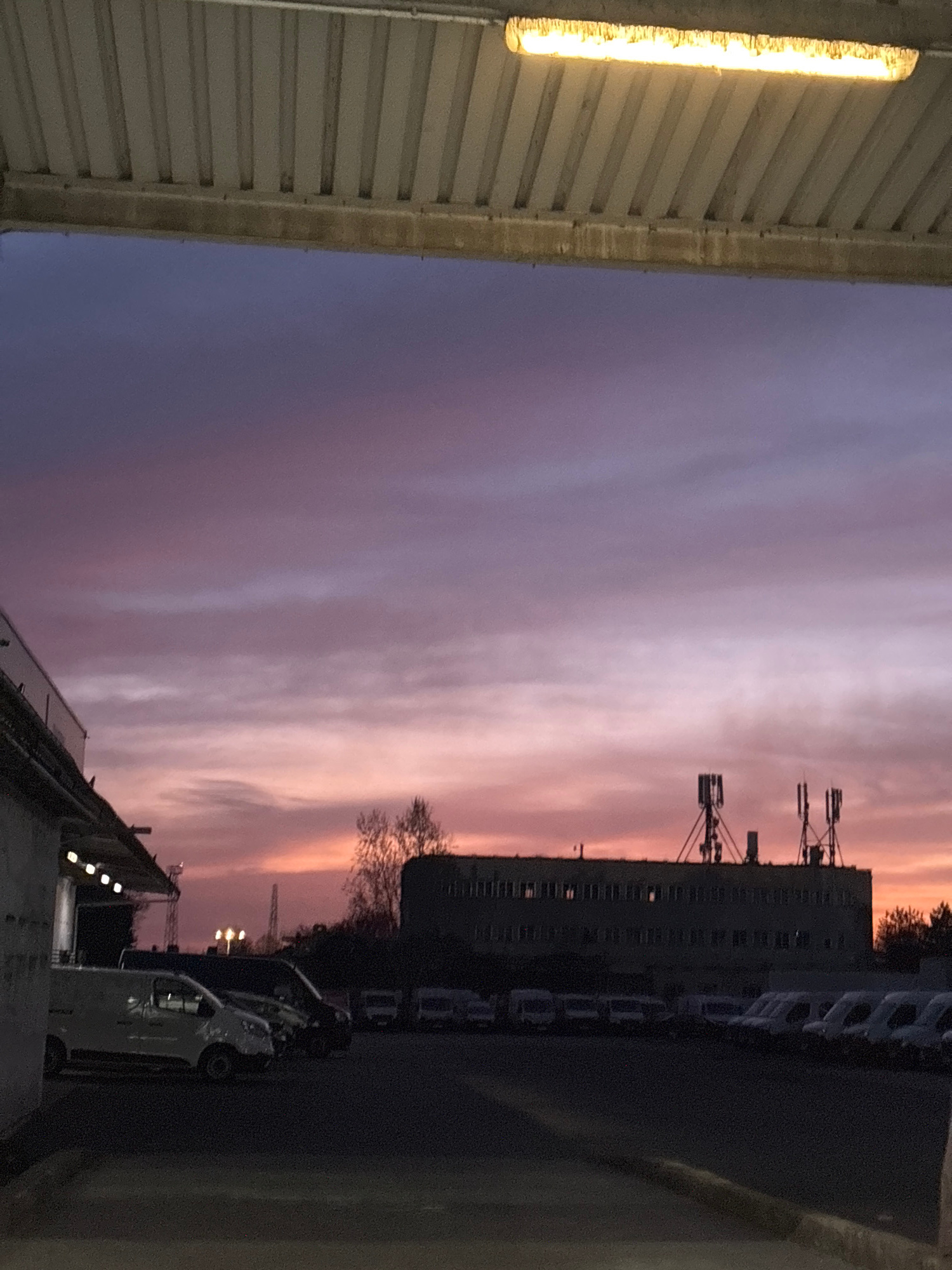 The image captures an outdoor urban or industrial scene at twilight or dawn, likely in Burgas, Bulgaria. The most striking feature is the sky, which displays a beautiful gradient of colors, transition…read more