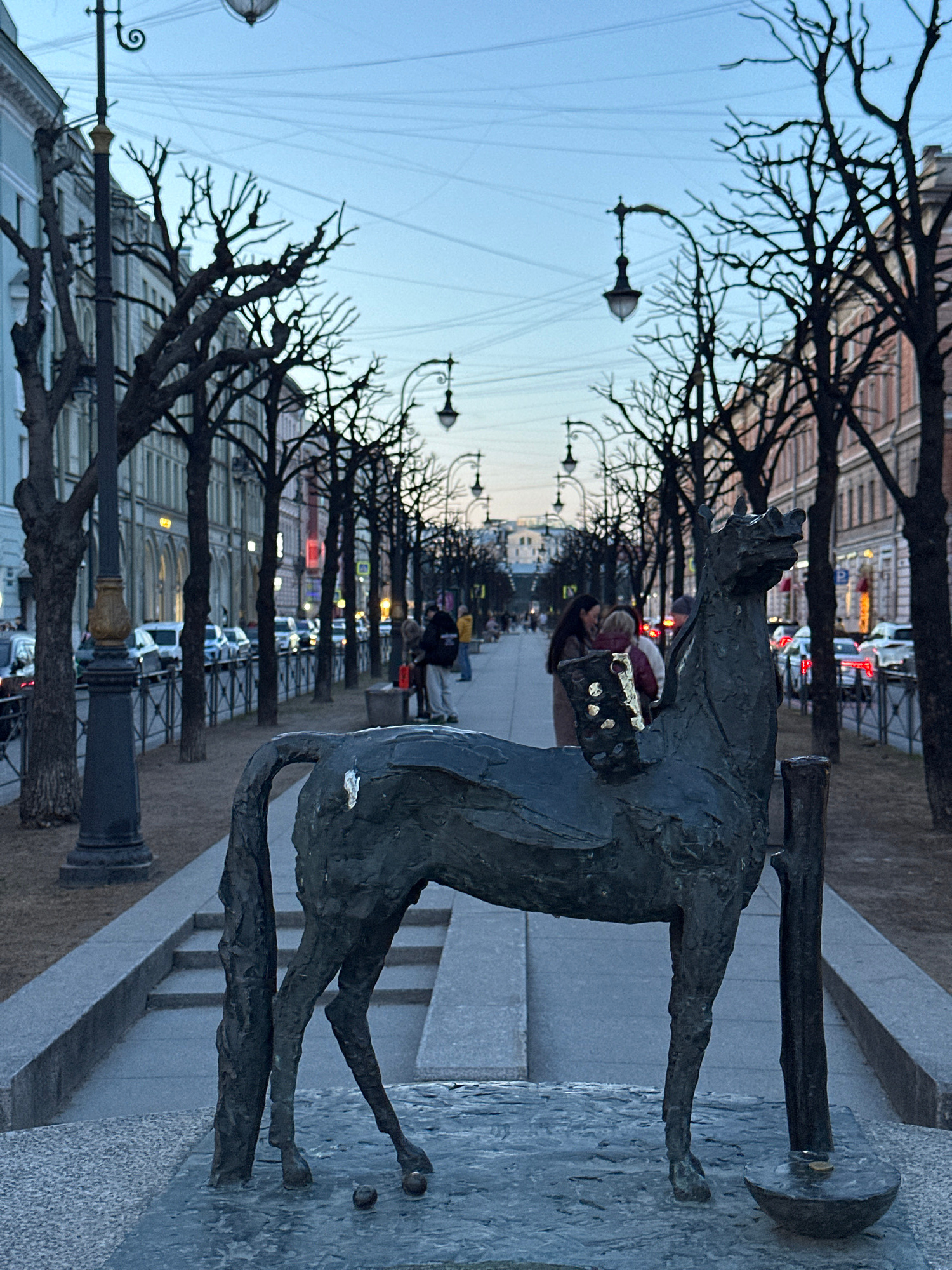 The image captures a bronze sculpture of a dog known as Gavryusha, located in Saint Petersburg, Russia. The sculpture is positioned on a low pedestal along a street with a row of bare trees and period…read more