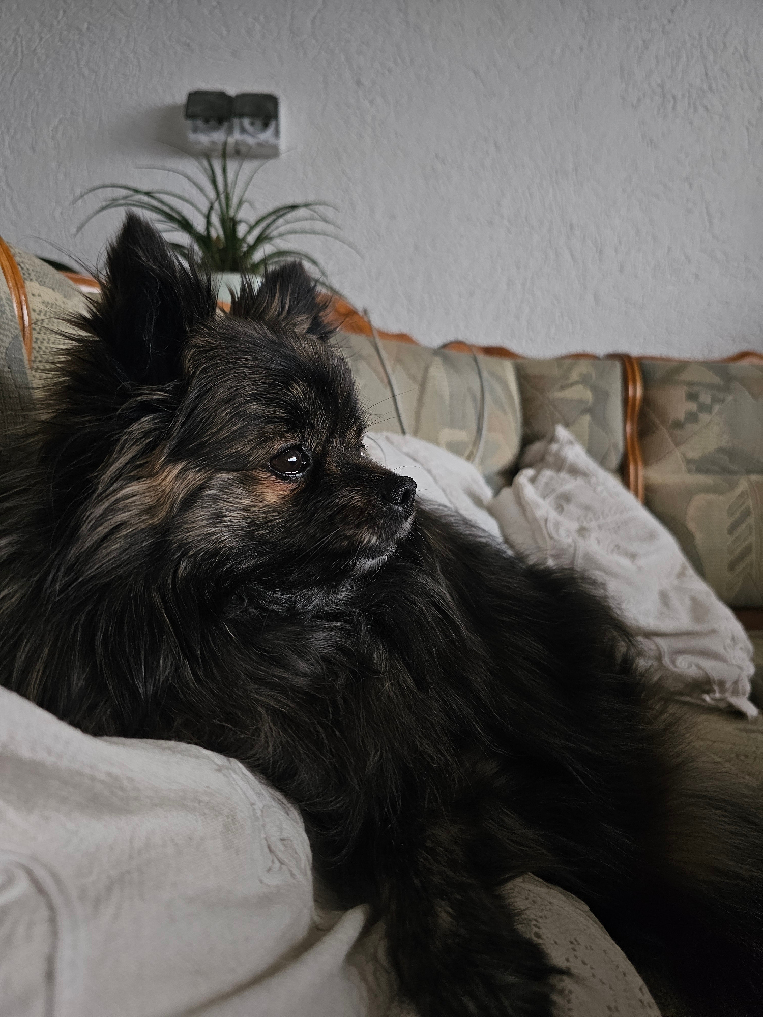 A dark, long-haired dog rests on an upholstered couch covered with white linens. The dog's head is near the left side of the frame, looking upwards. In the background, a white wall is visible, featuri…read more