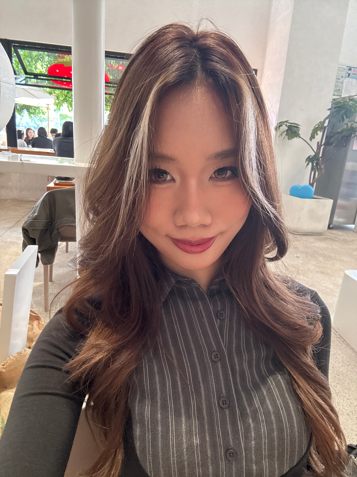 A woman with brown and blonde highlights poses indoors. She wears a gray striped button-up shirt. Outside the window, there are trees and what appears to be other people. Given the location informatio…read more
