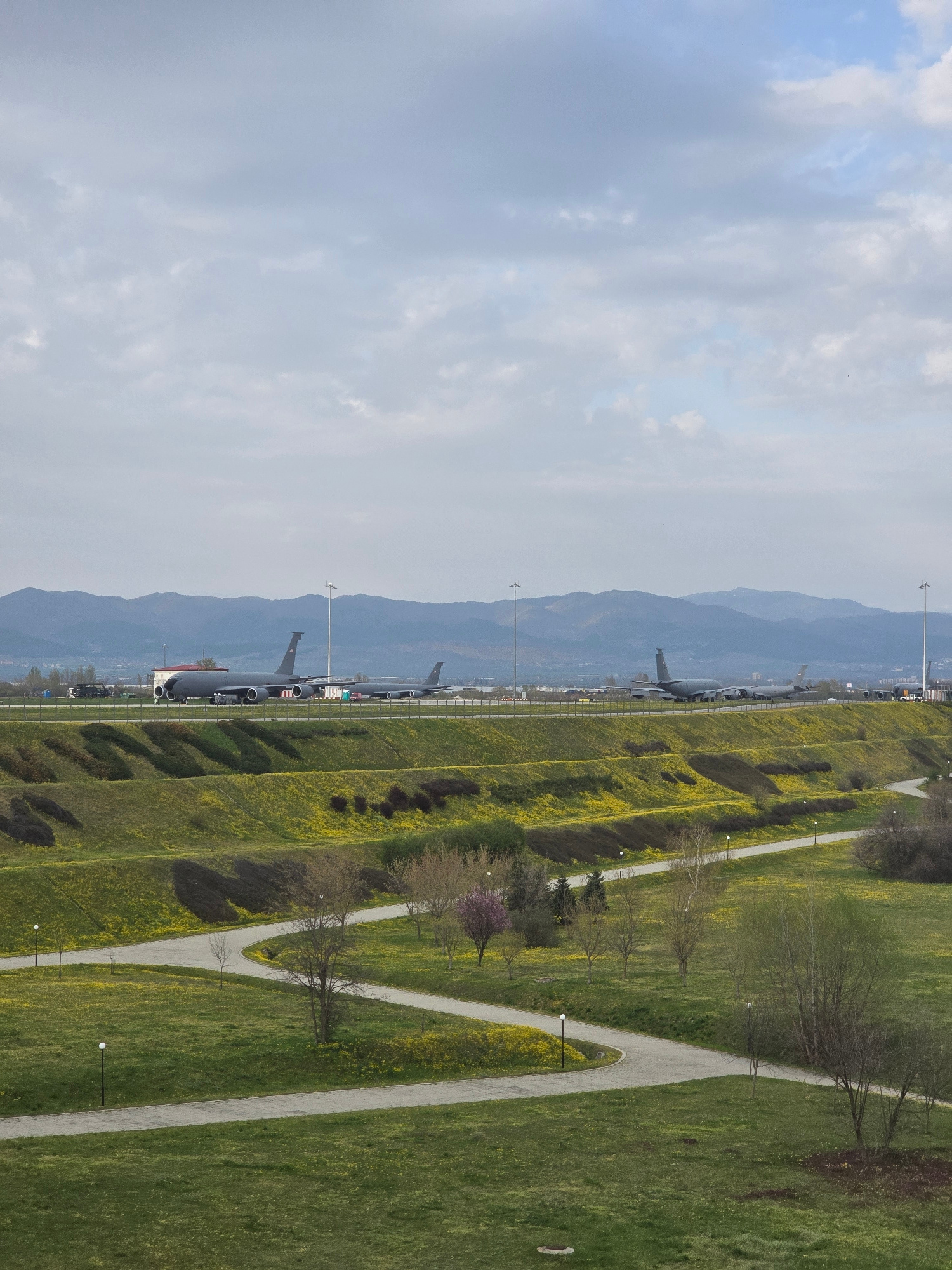 The image shows a park scene with airplanes in the background, located in Sofia, Bulgaria. The right side of the image is a grassy area with yellow flowers and walking paths. On the left, there is a v…read more
