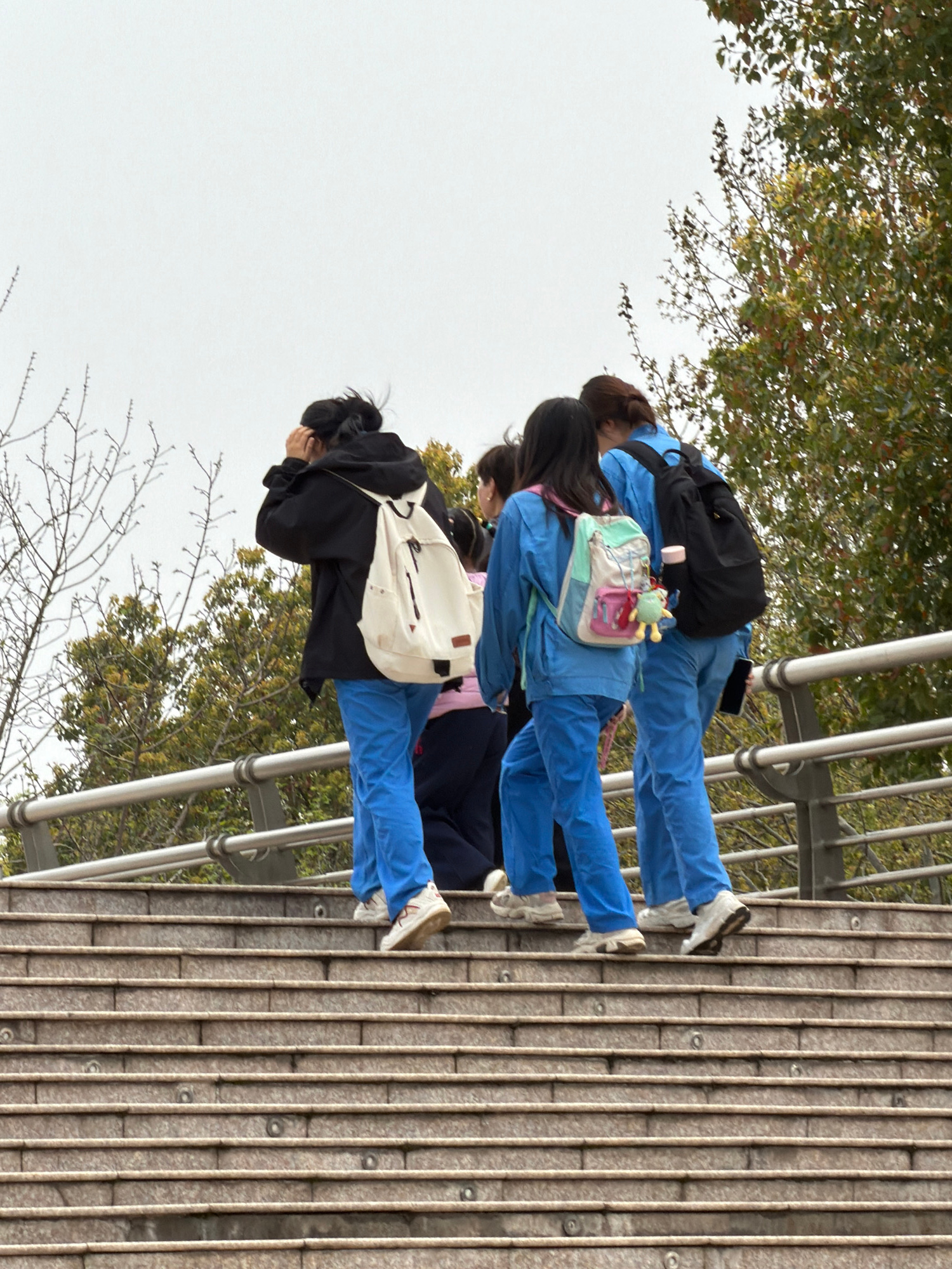 Four individuals are positioned on a walkway with metal railings, presumably a bridge or elevated structure. They are oriented towards the right side of the frame. The individuals are wearing similar…read more