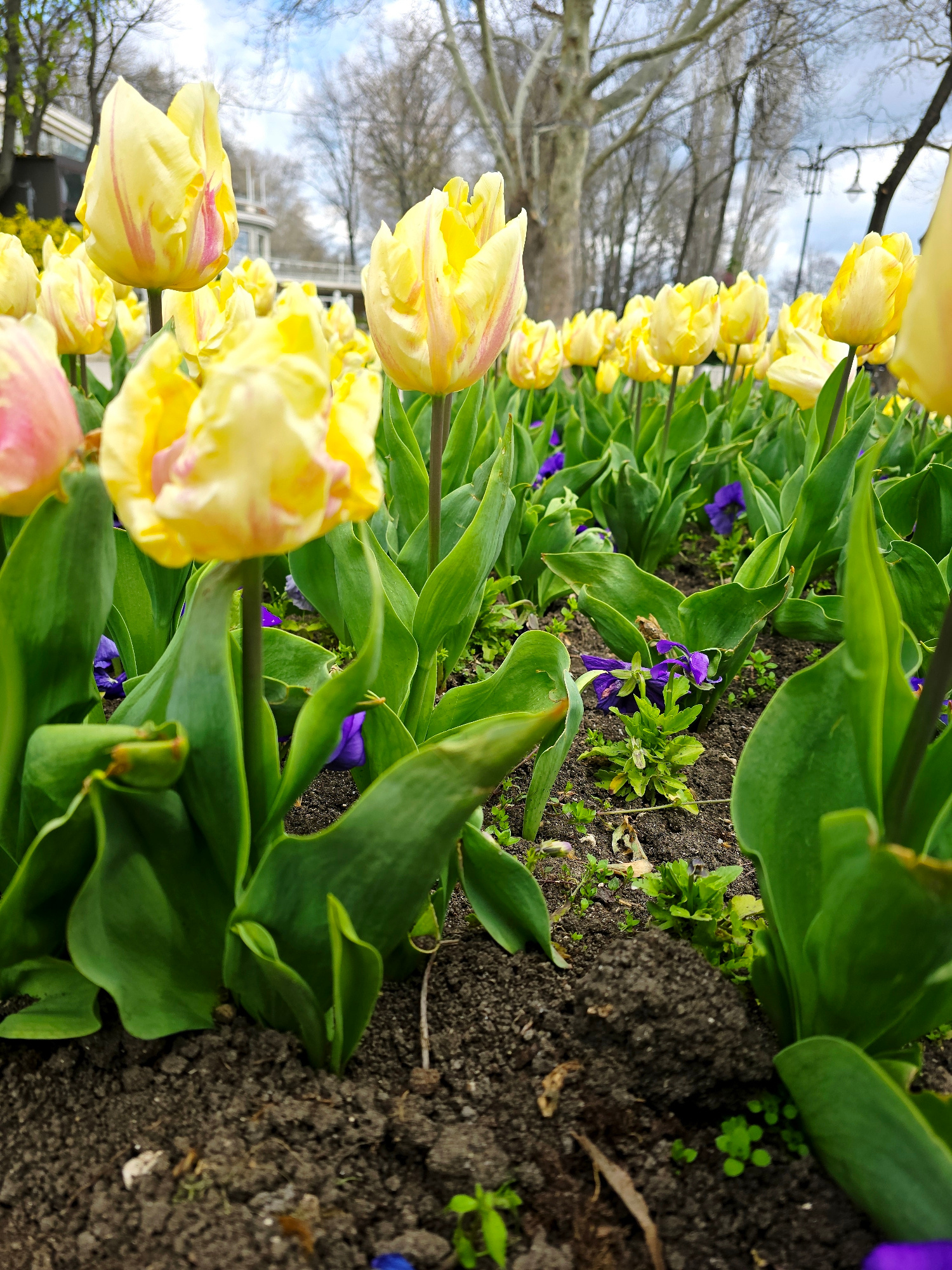 A ground-level, close-up shot displays a row of yellow tulips with pink stripes and green leaves, interspersed with small purple flowers. The tulips are aligned from the lower left corner of the frame…read more