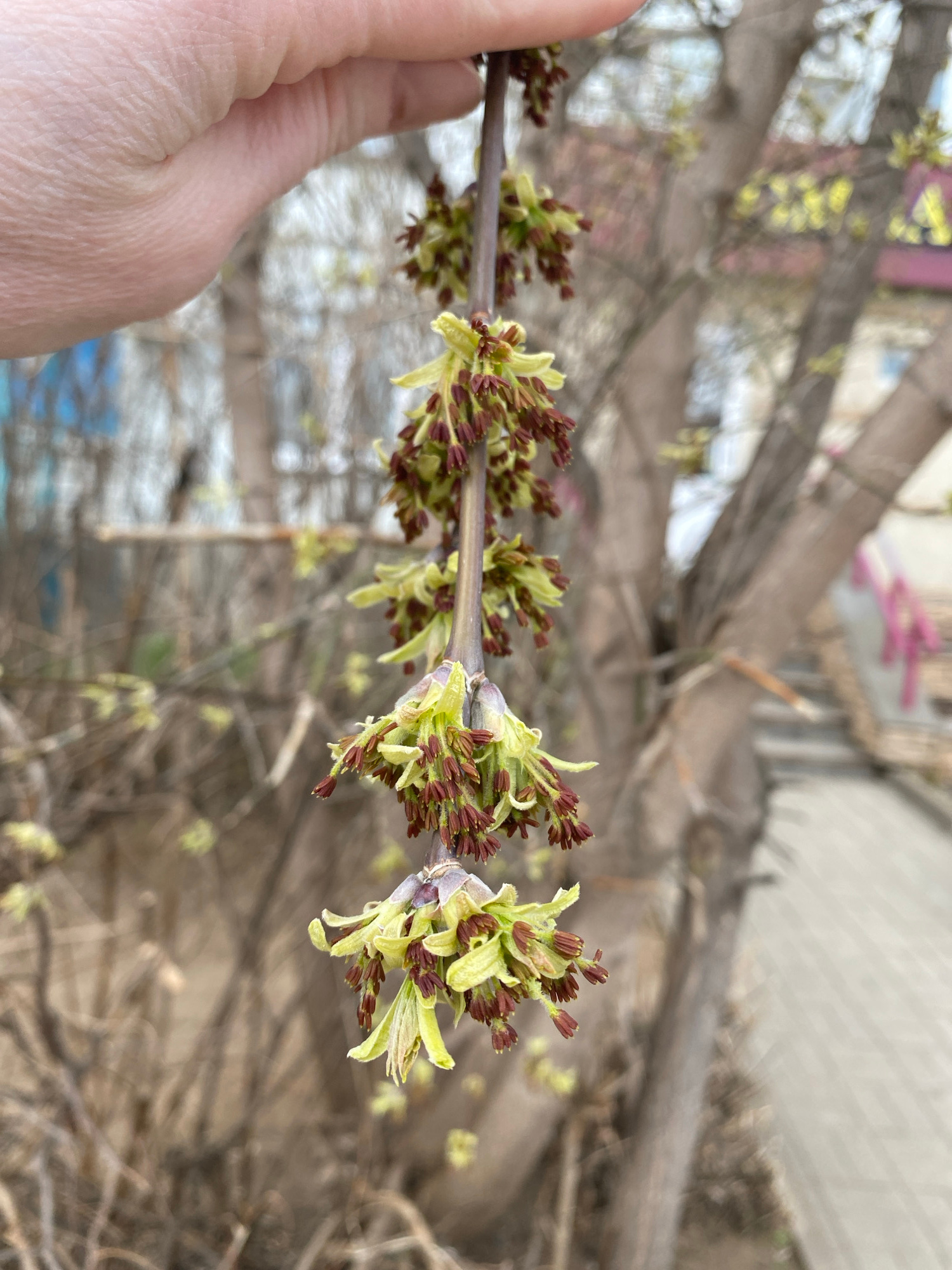 A close-up shot depicts a branch of a tree in early spring, held by a hand. The branch is characterized by clusters of burgeoning buds and nascent leaves. These clusters consist of small, reddish-brow…read more