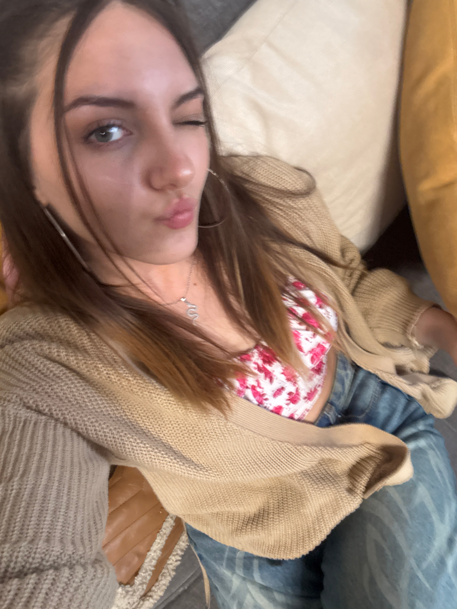 A young woman is lying on a gray sofa. She is wearing blue jeans, a white top with red floral print, and a beige cardigan. She is lying between two pillows, one yellow and one beige. She is wearing si…read more