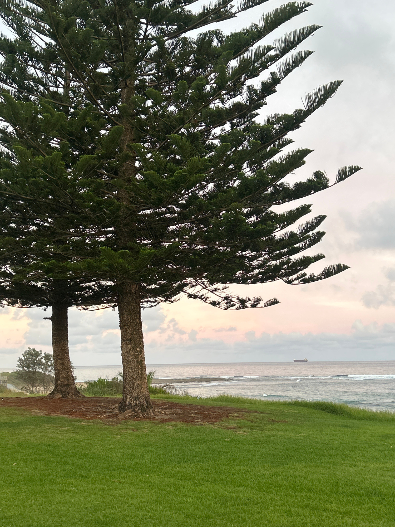 The image depicts a coastal scene in Bulli, Australia, featuring two prominent Norfolk Island pine trees in the foreground. The trees are leaning noticeably, suggesting they are subjected to strong wi…read more