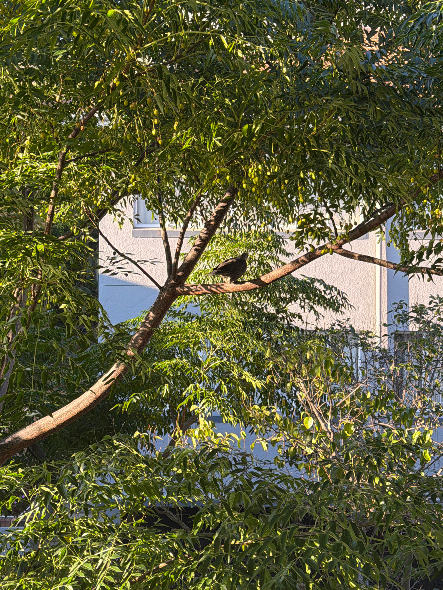 A black bird is perched on a branch of a tree, viewed from below. The tree's branches are filled with green leaves, partially obscuring a white building in the background. The location appears to be C…read more