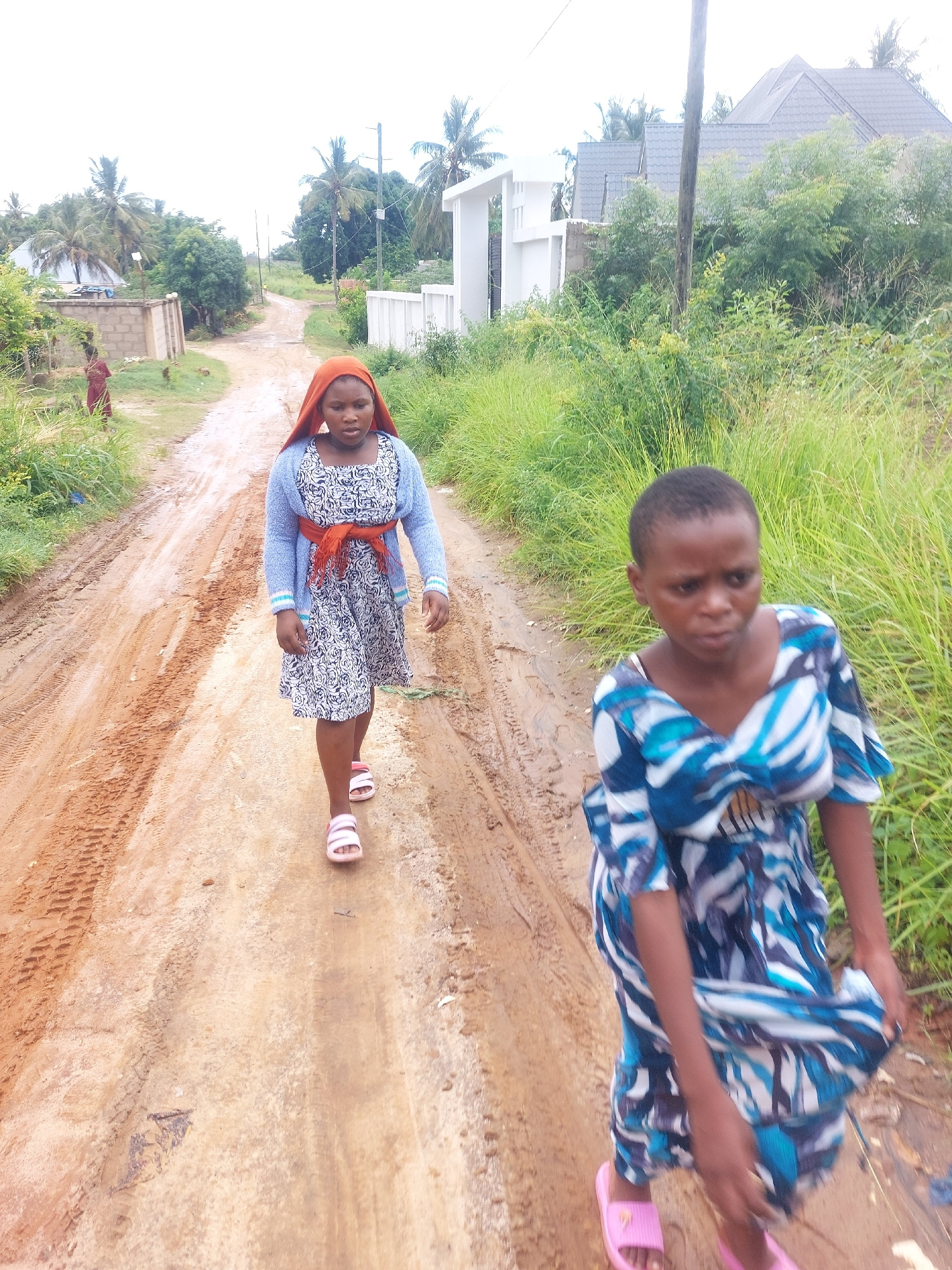 The image displays two young women standing on a muddy, unpaved dirt road, set in a residential or semi-rural area, consistent with parts of Dar es-Salaam, Tanzania. The photograph is oriented vertica…read more