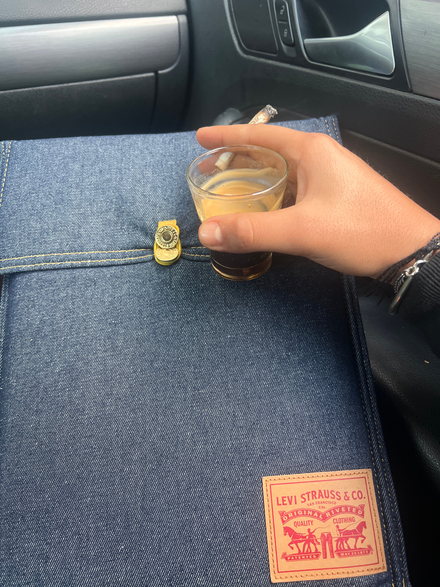 A person's hand is holding a clear glass with a light-colored liquid inside. A lit cigarette is perched on the edge of the glass. The glass rests on a blue denim fabric with a Levi Strauss & Co. labelβ¦read more