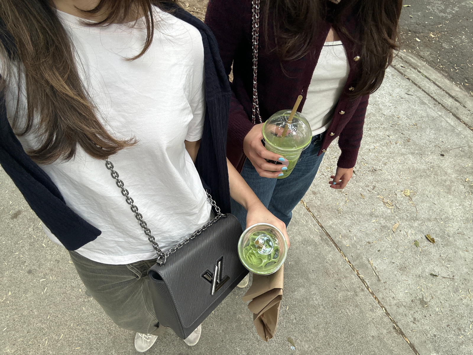 Two people are seated outdoors on a concrete surface, possibly a sidewalk. The person on the right is wearing grey/green pants, white sneakers, a white shirt, and a black cardigan. They have a black L…read more