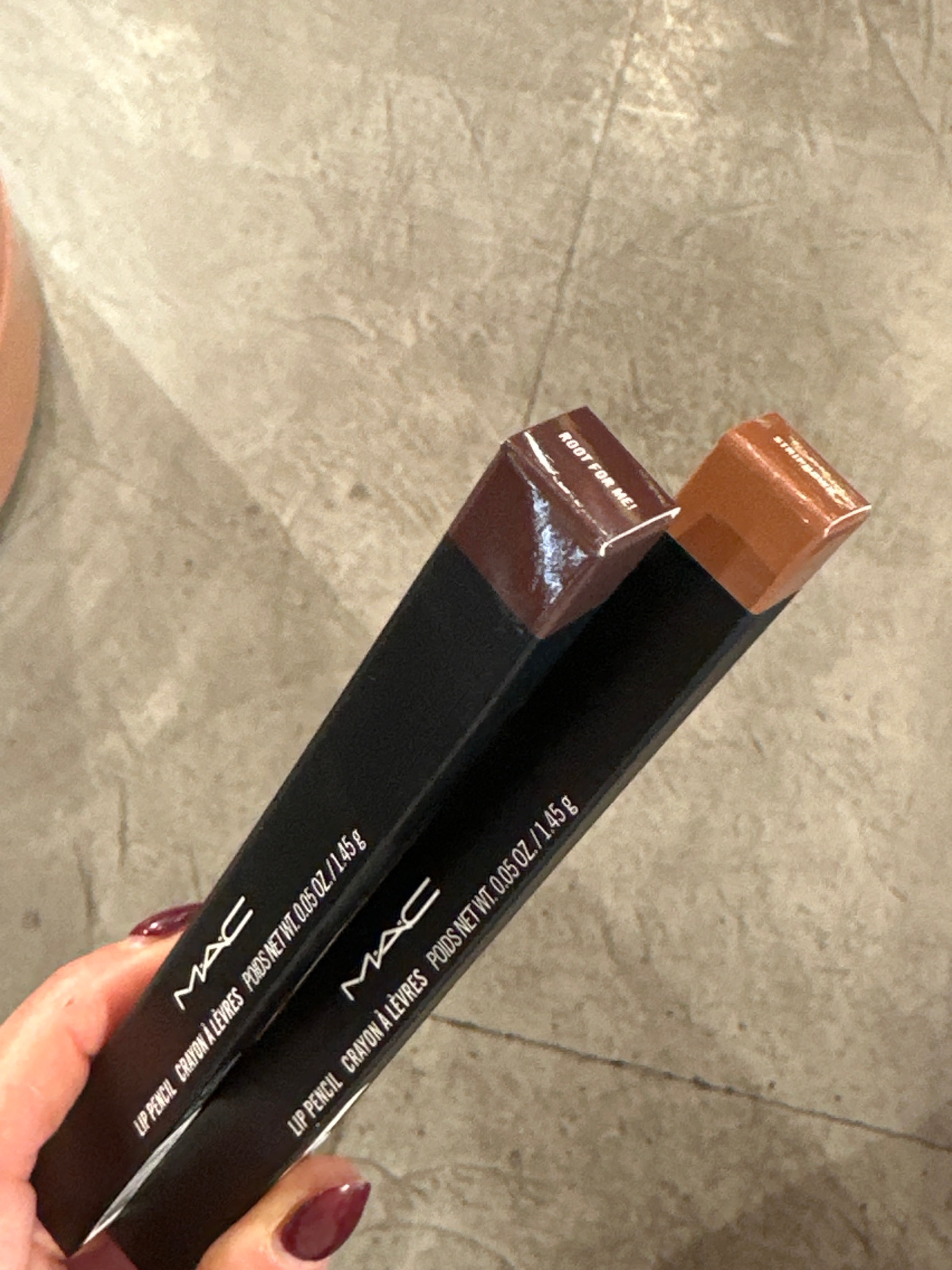 A close-up, high-angle shot captures a person's hand holding two MAC Lip Pencils in their black packaging against a light-colored, textured floor. The hand, adorned with dark red or burgundy nail polish, holds the two products horizontally. Both product boxes clearly display the "MAC" logo in white, along with the text "LIP PENCIL CRAYON À LÈVRES" and the weight "POIDS NET WT. 0.05 OZ./1.45 g". The ends of the lip pencils, protruding from their boxes, reveal their respective shades and names. The top pencil is a lighter, warm brown color, with partially visible text that appears to read "STRIPPED". The bottom pencil is a darker, rich brown shade, and its name is clearly visible as "ROOT FOR ME!". The background is an indistinct, light gray or beige floor surface with subtle variations in tone and texture, possibly concrete or a large tiled area. The scene appears to be indoors. There are no specific visual cues within the image itself to confirm the provided location context of London, United Kingdom. The image focuses on the products and the act of holding them, possibly during shopping or product inspection. | Open Wire