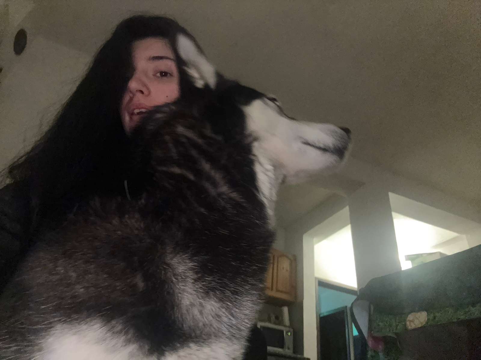 A husky dog is close to the camera, obscuring the face of a person who is lying down. The dog is black and white. In the blurred background, there is an interior with a table and a cabinet. The locati…read more