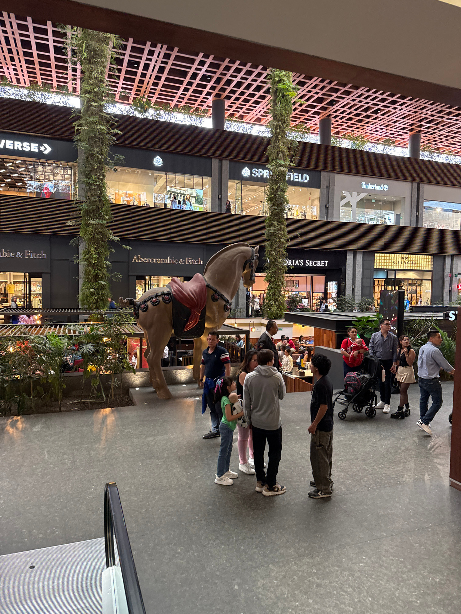 This photograph captures a multi-level indoor mall environment. Several stores are visible, including Abercrombie & Fitch, Converse, Springfield, Timberland, and Victoria’s Secret. Numerous individual…read more