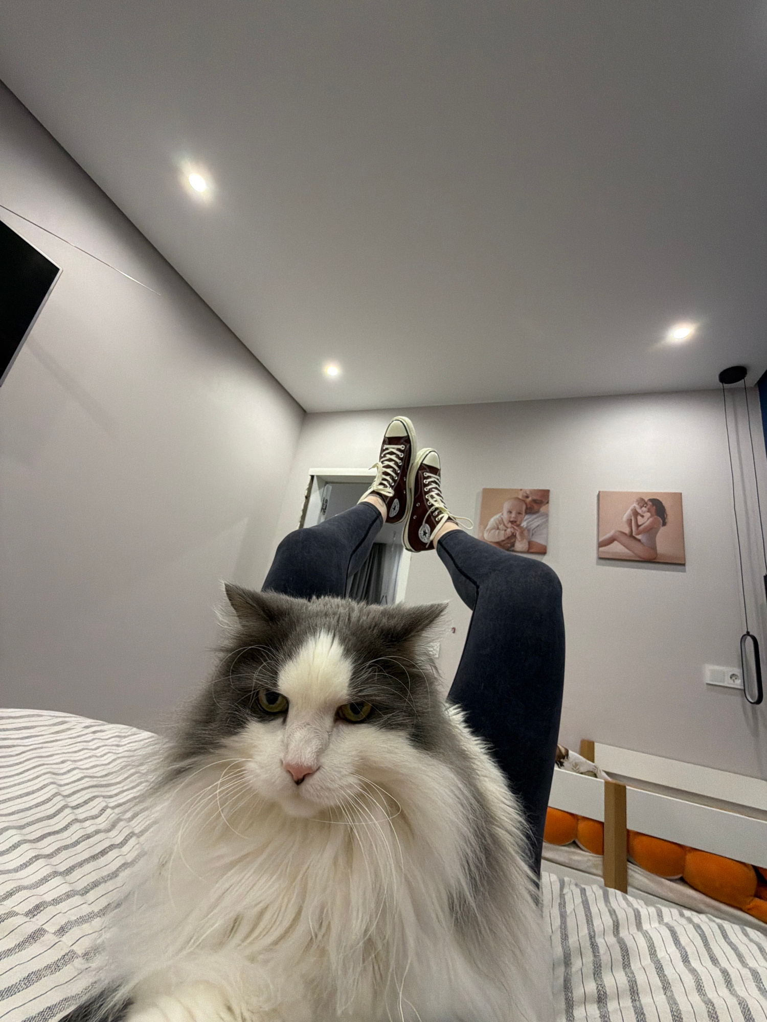 The image captures a casual indoor scene, likely in a bedroom, with a low perspective looking upwards. The primary subject is a fluffy, long-haired gray and white cat with striking green-yellow eyes a…read more