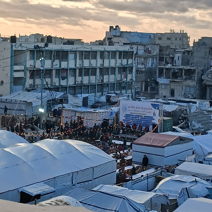 The image captures an outdoor gathering at dusk or dawn in an urban area of the city of Gaza, Palestinian Territory. Hundreds of people are seated on the ground or low benches in a central open space,…read more
