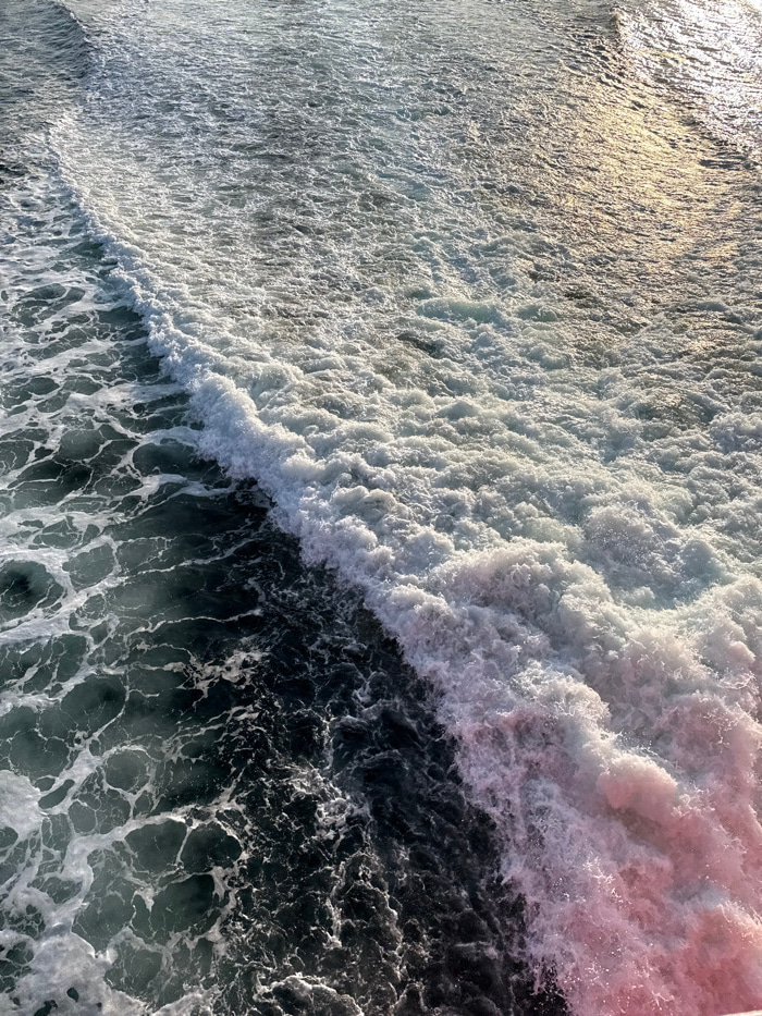 The image displays an overhead view of turbulent sea water in Palaiopoli, Greece. A prominent, diagonal line of dense white foam and breaking wave activity traverses the frame from the lower left to t…read more
