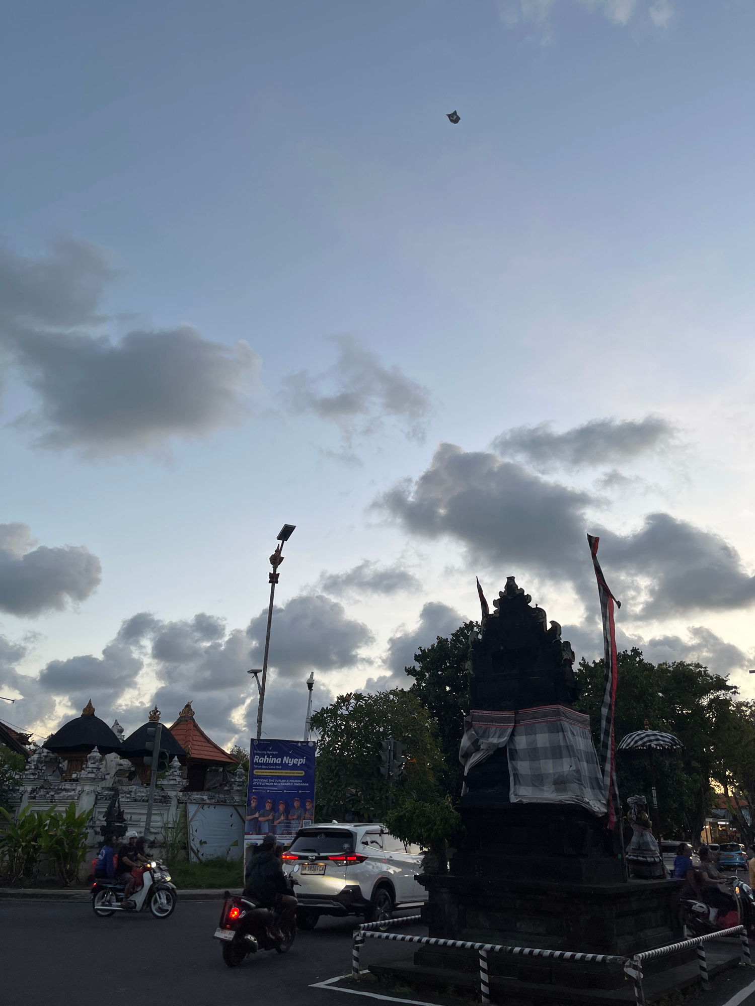 The photograph captures a streetscape in Kuta Selatan, Indonesia, presenting a mixture of local culture and daily life under a partly cloudy sky. A black kite is visible high up in the sky on the uppe…read more