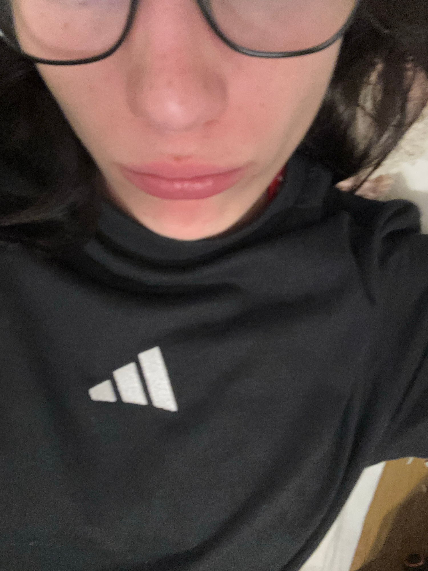 A close-up, partially obscured selfie of a person with fair skin, wearing glasses, and a black Adidas sweatshirt. The person's nose, lips, and part of their left eye (through the glasses) are visible.…read more