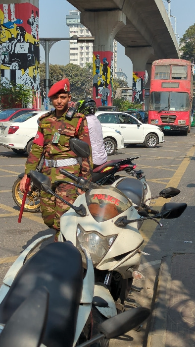 A man in a military uniform and red beret stands next to a parked motorcycle with "POLICE" written on its windshield. Cars and a red double-decker bus are visible in the background, under an elevated…read more