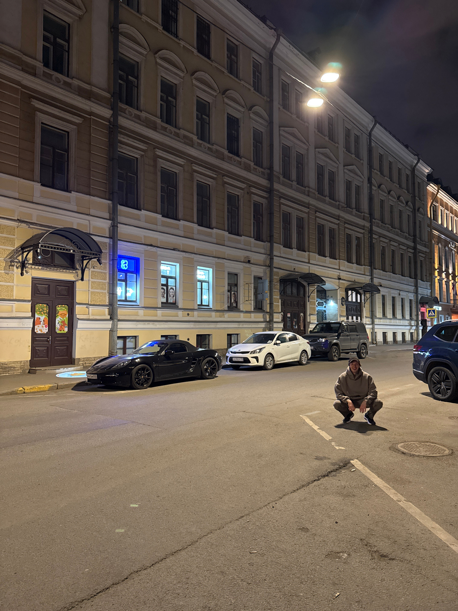 The image depicts a street scene in Saint Petersburg, Russia at night. The street is illuminated by street lamps and artificial lighting from buildings. Buildings with classical architecture line theβ¦read more