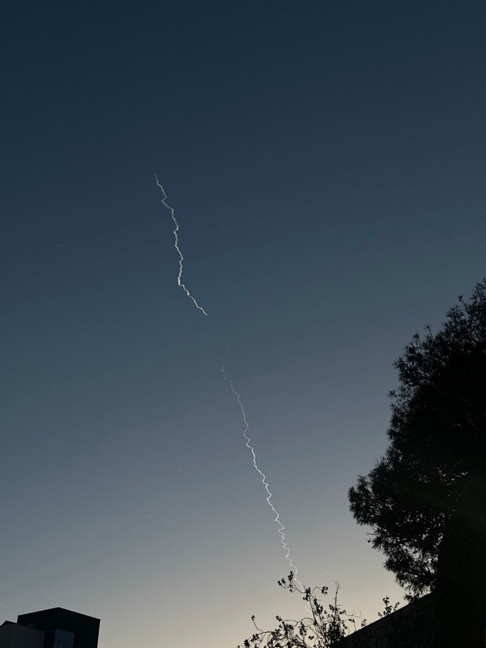 The image displays a twilight sky over the city of Haifa, Israel. The sky transitions from a deep blue at the top to a lighter, paler blue near the horizon. Two distinct, white, winding trails are visβ¦read more
